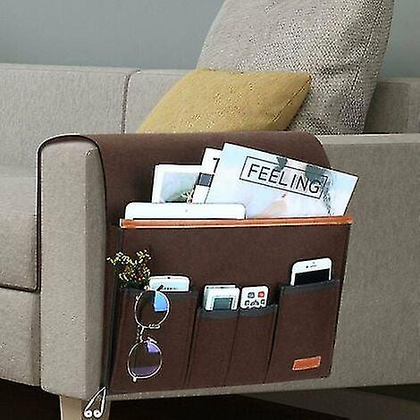 Description colorbrown Upgrade Design: The armrest organizer is upgraded with a slimmer design. The main pocket has a compact size of 35cm*23cm*5cm, can keep in good shape when organizing lots of your necessities. 2 metal holes for hanging this organizer remotely, 3 velcros on the flap make it adhere firmly and non-slip on the sofa armrest. Multiple Pockets: The sofa storage organizer with 4 small pockets and one large pocket can meet your storage needs. You can put newspaper, magazines, iPad and tablet in the big pockets. Put remotes, glasses, cell phones and other portable devices in the four standard pockets, keeping them close at hand when you need them. Multiple Usages: Stay in place when this sofa organizer is placed on sofa, chair, recliner, even with heavy items. Can also be hung on the wall, table and bedside. So it is really suitable for various places like living room, bedroom, office and hotel room. Durable Material: The sofa armrest organizer is made of high quality felt fabric, which is extremely durable while not losing softness. It's also wrinkle resistant, won't fade or shrink. Three colors meets your needs of different interior styles. Easy to install: slide the organizer flap under the sofa cushion, then cover the sofa armrest. You can also stick this remote control holder on the armrest of your sofa through.