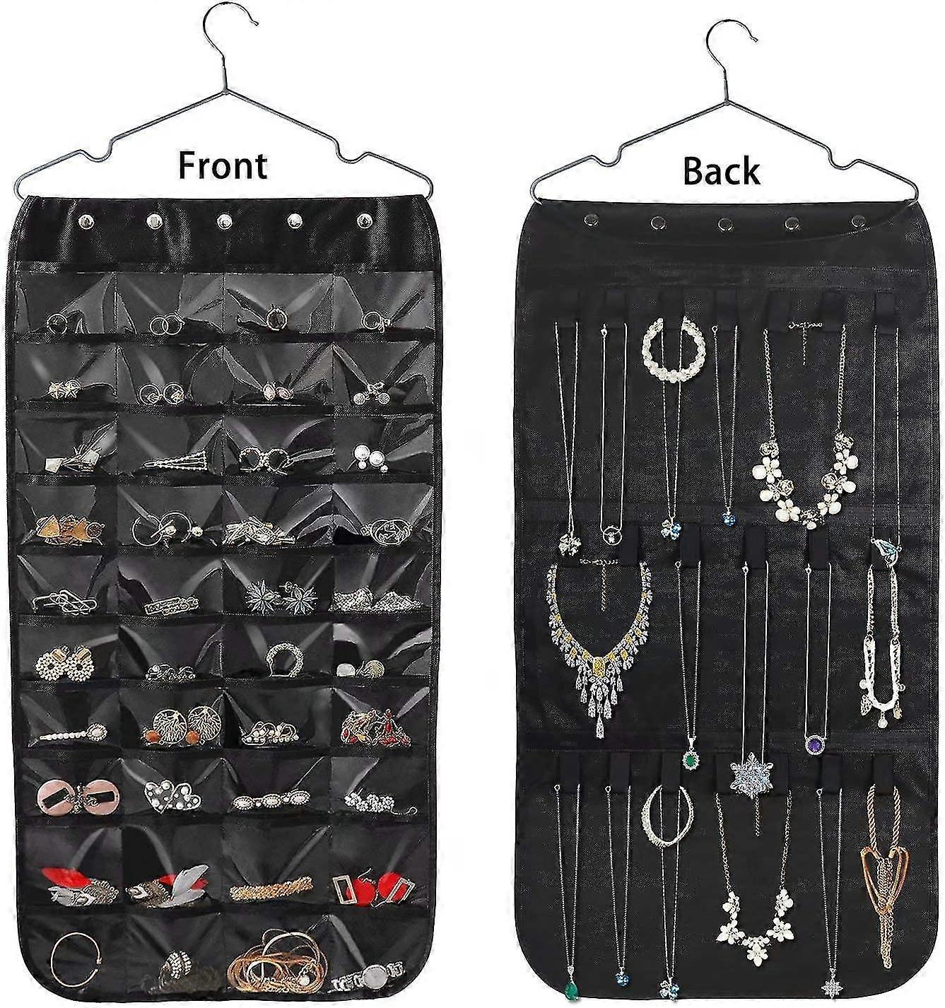 SPACE SAVING JEWELRY ORGANIZERCloset complete 40 pocket and 20 magic tape hook hanging jewelry organizer are made with precision, offering a convenient way to store jewelry and other small accessories. Hang this organizer on a pole, door or wall with confidence it wont slip off.^TOP QUALITY MATERIALSThis sturdy jewelry organizer is made of premium non-woven and PVC material, firm and durable. Waterproof, convenient to clean.^SORT, STORE AND DISPLAYNever waste another minute sorting or searching for misplaced jewelry. Store your jewelry collection in one easy to view 40 pocket organizer. Discover new jewelry instead of choosing the same old item from the top of your jewelry box.^DESIGNED FOR PRACTICALITYEasily navigate this double sided jewelry organizer by rotating through an angle of 360 Degree. On its one side there are 40 transparent pockets to hold your rings, earrings, bracelets, watches and even cosmetics or nail polish The other side has 20 self adhesive loops to accommodate your necklaces. See? Everything will finally find its place^CUSTOMER SERVICEIf you have any questions, please contact us in time, we will be happy to answer you.^