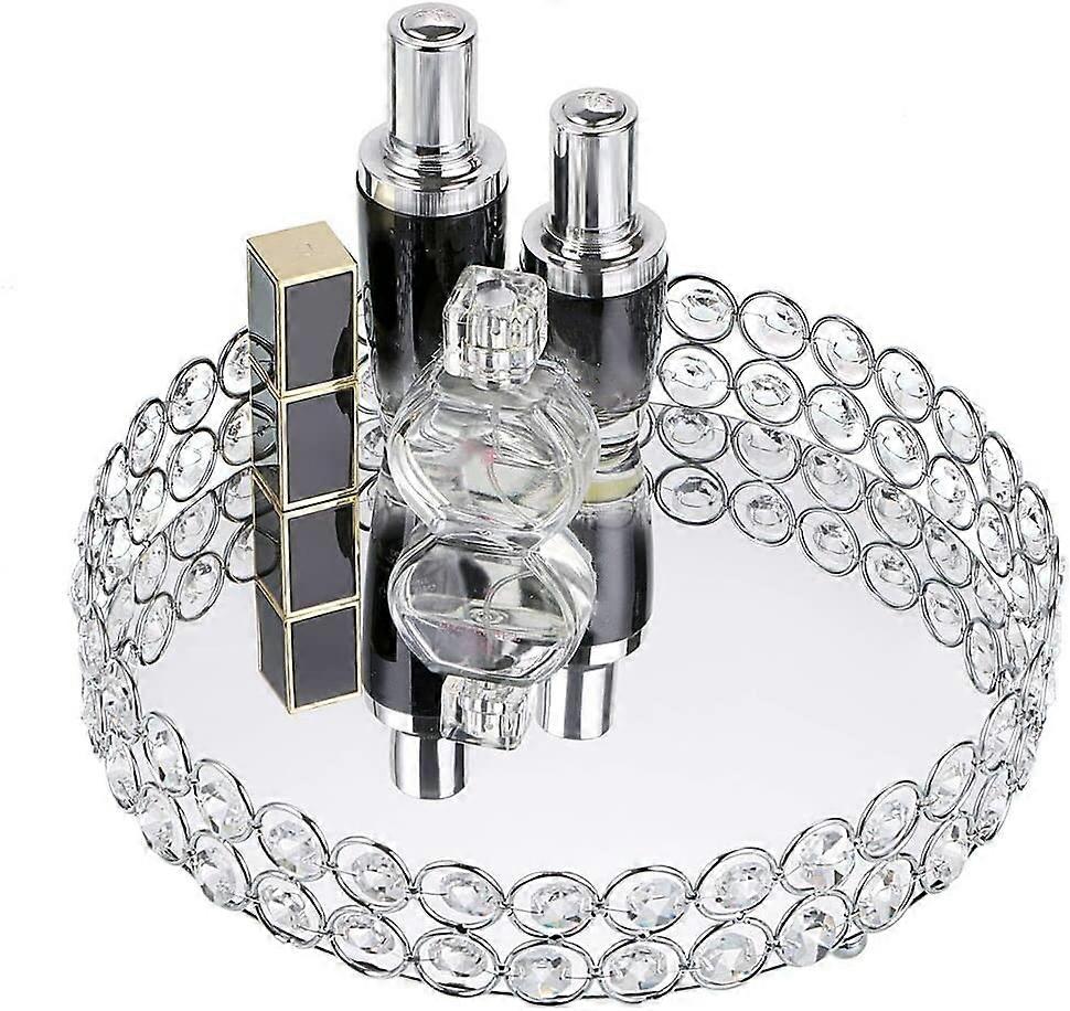 Crystal Makeup Tray Dresser Cosmetic Mirror Organizer Tray (Round 9.8")