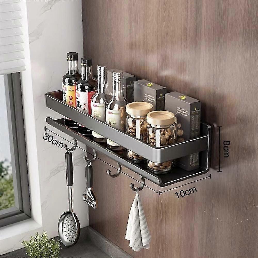 Kitchen Shelf 30cm Carbon Steel Kitchen Spice Storage Rack Wall Mounted No Drilling Seasoning Bottle Shelf with Hooks