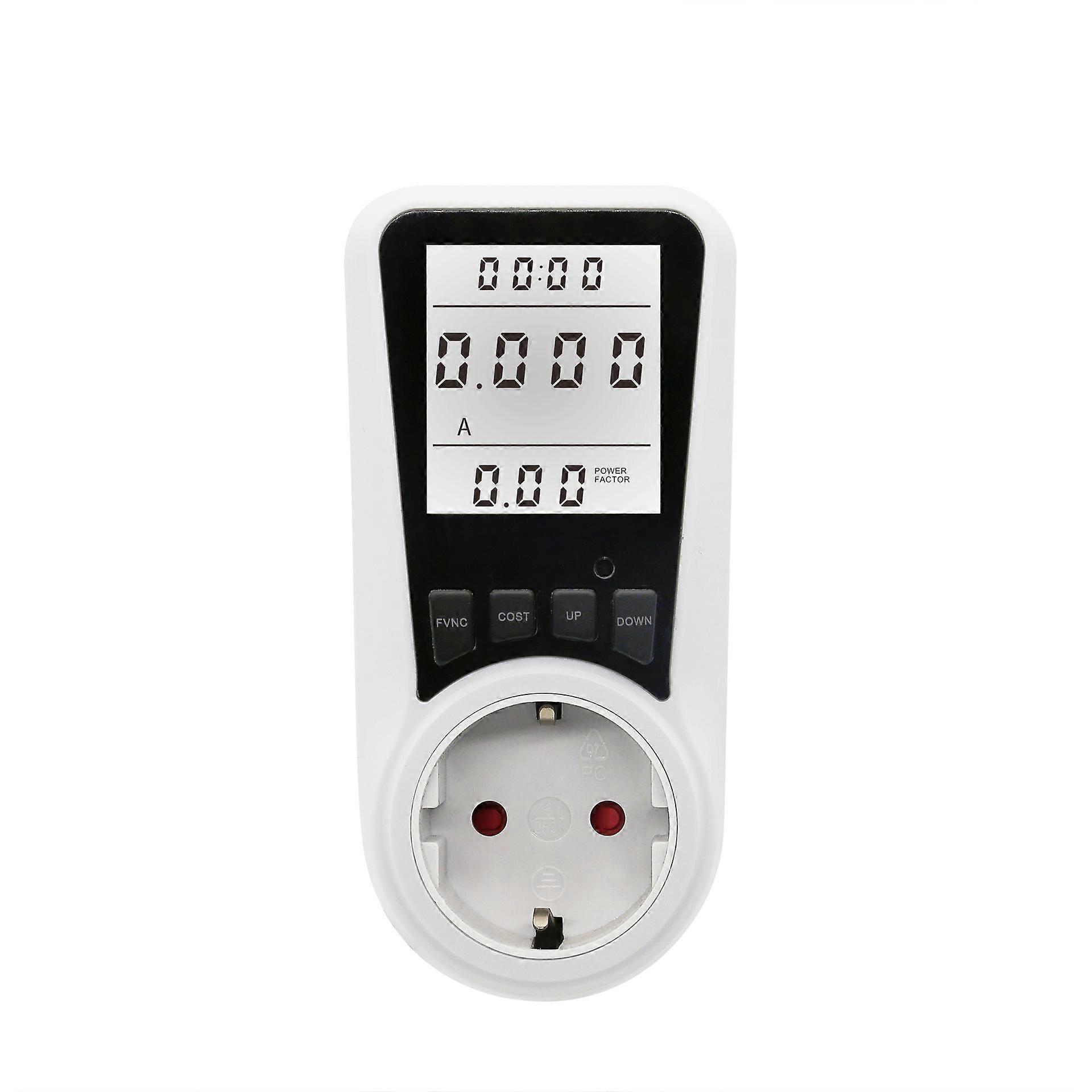 European plug, wattmeter socket, voltage and current meter, home appliance monitoring and billing device The meter has a clear LCD display that can read volts, watts, amperes and kWh. The electricity price can be used to calculate the total electricity cost of the device. Measurement current accuracy: +/- 2% Measurement power accuracy: +/-2% Battery: 3.6V NiMH battery, Rechargeable battery Power supply: 230V AC 50Hz Maximum load: 16A, 3680W Current: 0.0A-16.0A