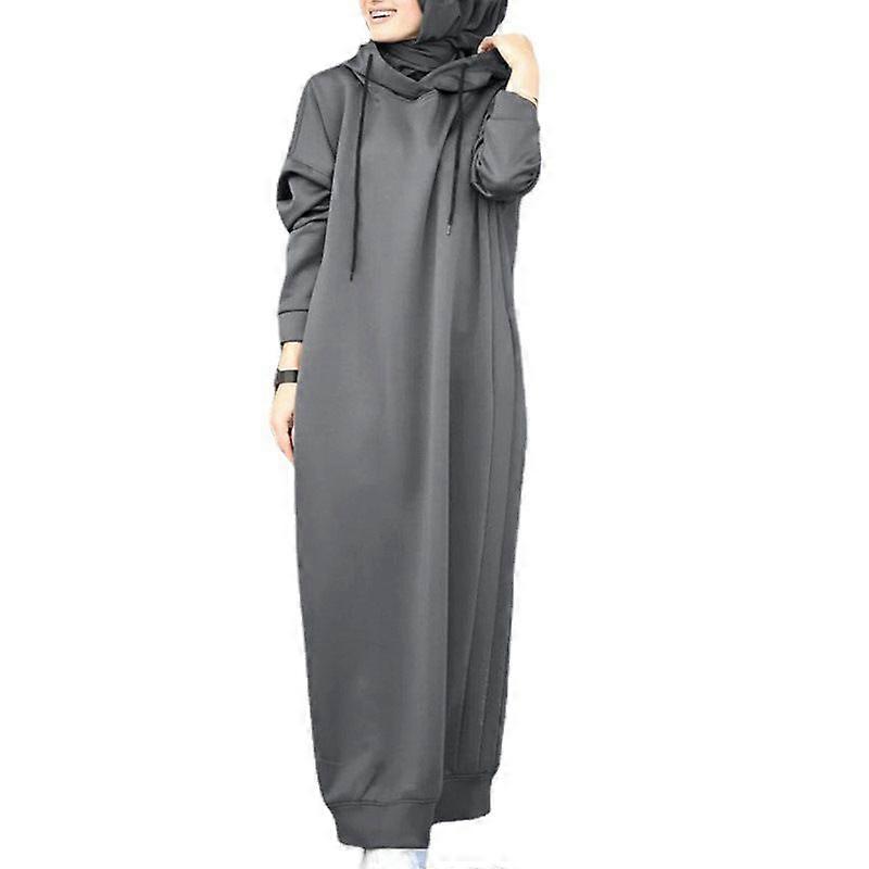 Muslim Spring and Autumn Women's Drawstring Loose Casual Pocket Long Sleeve Hoodie Sweater Dress Solid Color