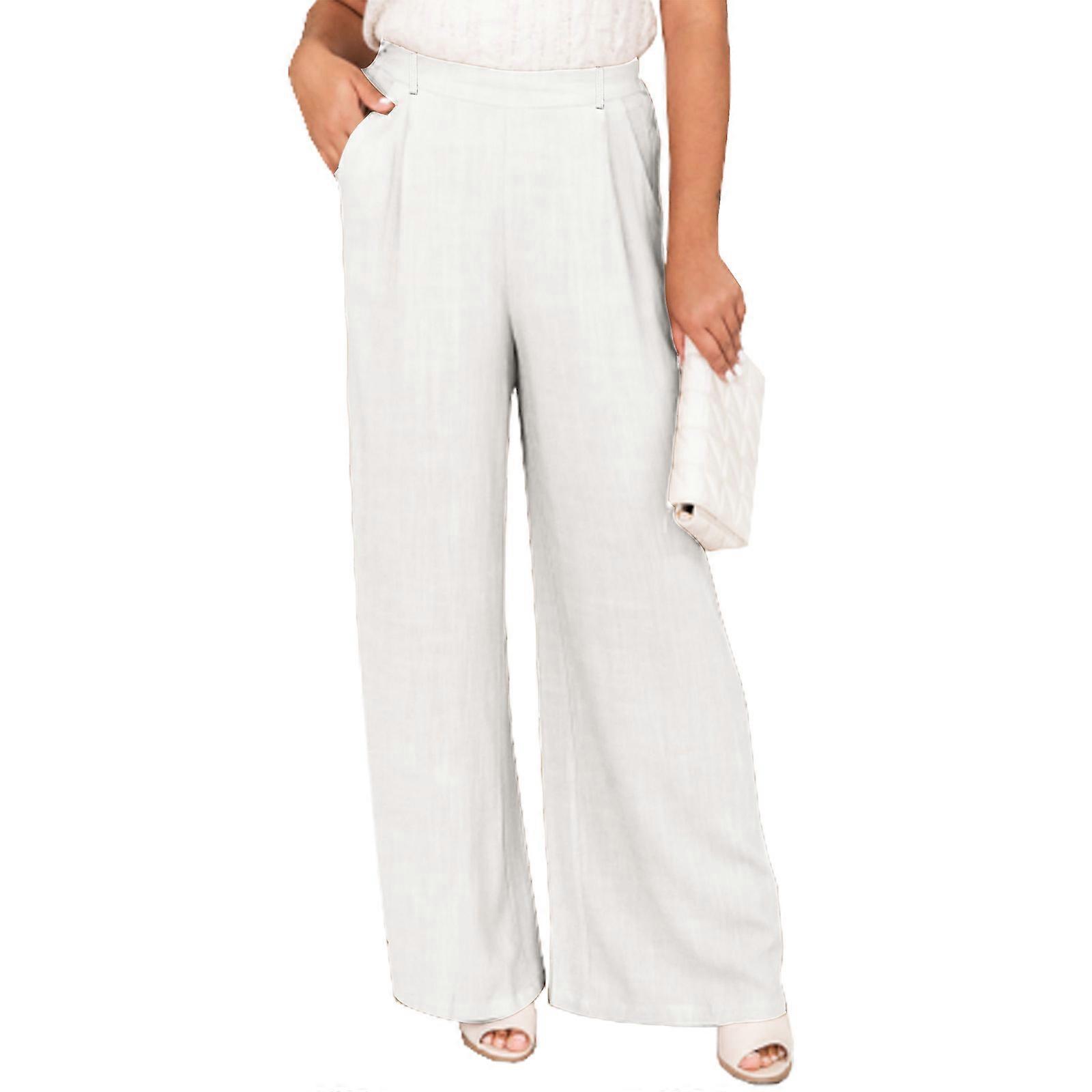 High Waist Elastic Waist Pants Linen Soft Pockets Casual Style Trousers Solid Color Loose Fit School Office Ladies Cloth White L