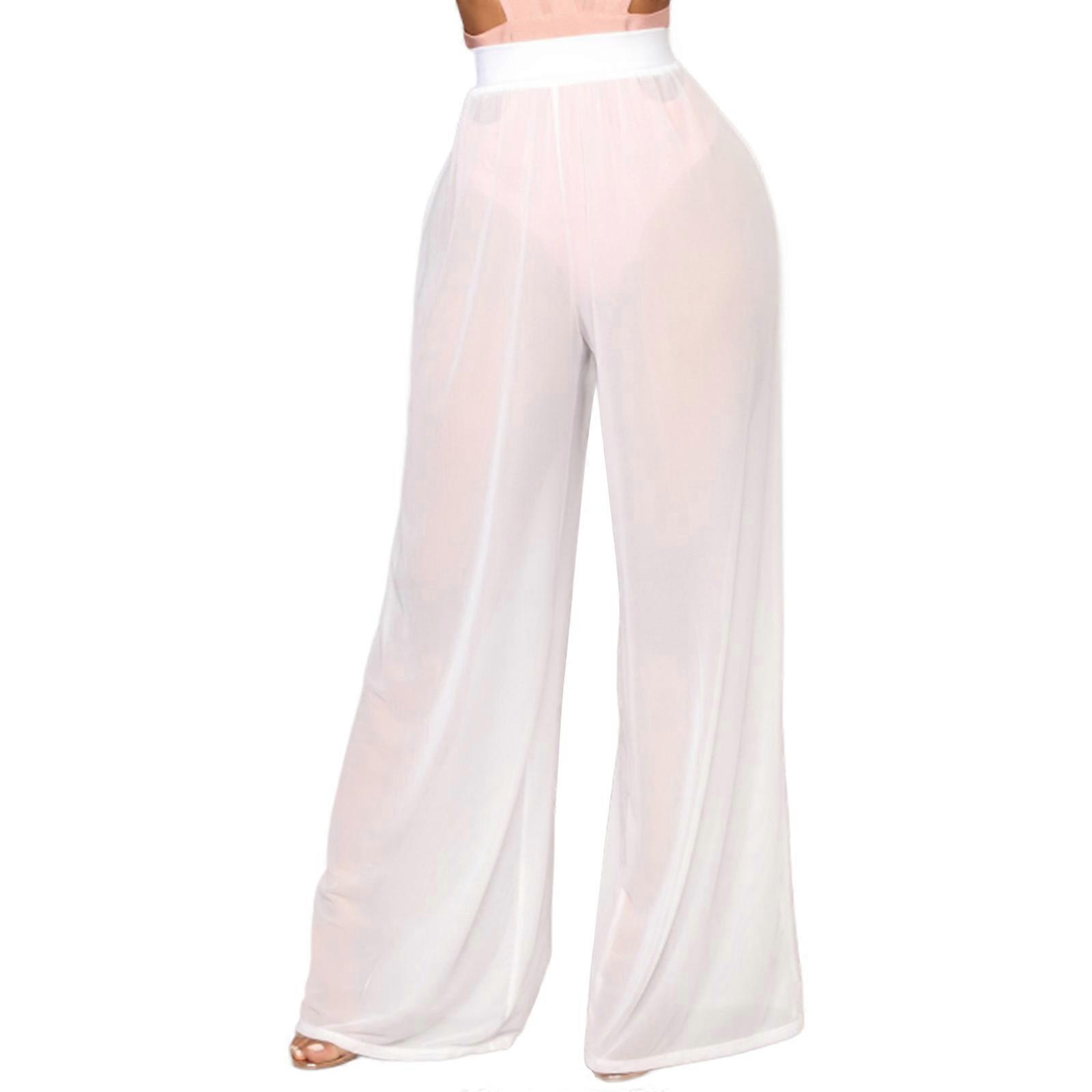 High Waist Elastic Pant Solid Color Wide-Leg Grenadine Cover Up Cloth See Throug Mesh Flares Swimsuit for Women Girl White M