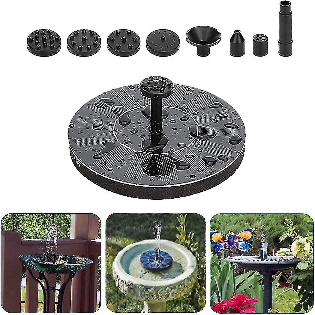 latest upgraded solar powered fountain pump, environment friendly, easy installment, and 6 different fountain patterns.Environment friendlySolar-powered, just need sunlight, no battery or electricity needed, eco-friendly for the environment. Solar fountain pump will start to work in about 3 seconds once being exposed to sufficient sunlight.Easy installmentThe fountain pump can be installed easily without tools. Just put the solar fountain pump on the water surface and under the sun.Beautify your gardenThis solar fountain can beautify your birdbath, fish tank, garden, pool, pond, etc., and also may attract some butterflies, birds and other small animals to make your garden more beautiful and energetic, the passers-by will WOW for the beautiful. It can be also used as water circulation for oxygen for fish in pool.Different fountain pattern6 different types of nozzles allows you change fountain patterns at your will. The fountain can rise up to 12-23 inch (30-60 cm), and the height of fountain will change with sunlight intensity change.OPERATION GUIDE 1.Remove the film which covers the solar panel before using. 2. Set up the pump nozzles and do not put the top spray head on. 3. Put the pump totally in the water with its nozzle over the water. (Water should be clean without too much debris) 4. Ensure the pump under the enough sunshine, suggested in the midday sunshine. 5. Let the pump work without spray head for seconds to let the air go out of the pump. Then put on spray head to see if it could work well. NOTICE 1.When the sun is weak, the pump will not work continuously, but it will automatically start repeatedly when the sun is strong enough and the pump resumes continuous operation. 2. Don't make the pump work without water for a long time, or its lifespan will be shortened. 3. Please keep the water source clean and clean the pump regularly to prevent Impurities from being sucked into it and causing the pump work improperly. SPECIFICATION Solar pane Power: 7V/1.5W Pump Power:7V/1.0W Solar panel diameter: 6.3"(16cm) Max water flow height: 23"(60cm) / Regular:12~23"(30cm~60cm) Max Quantity of Flow: 190L/H Life time: 10000 Hours Delay: 3S (The pump will automatically restart within 3 seconds when the sun is shining) PACKAGE INCLUDES 1 Solar panel with pump 1 Nozzle base 1 Connection head 6 Nozzle heads 1 English manual