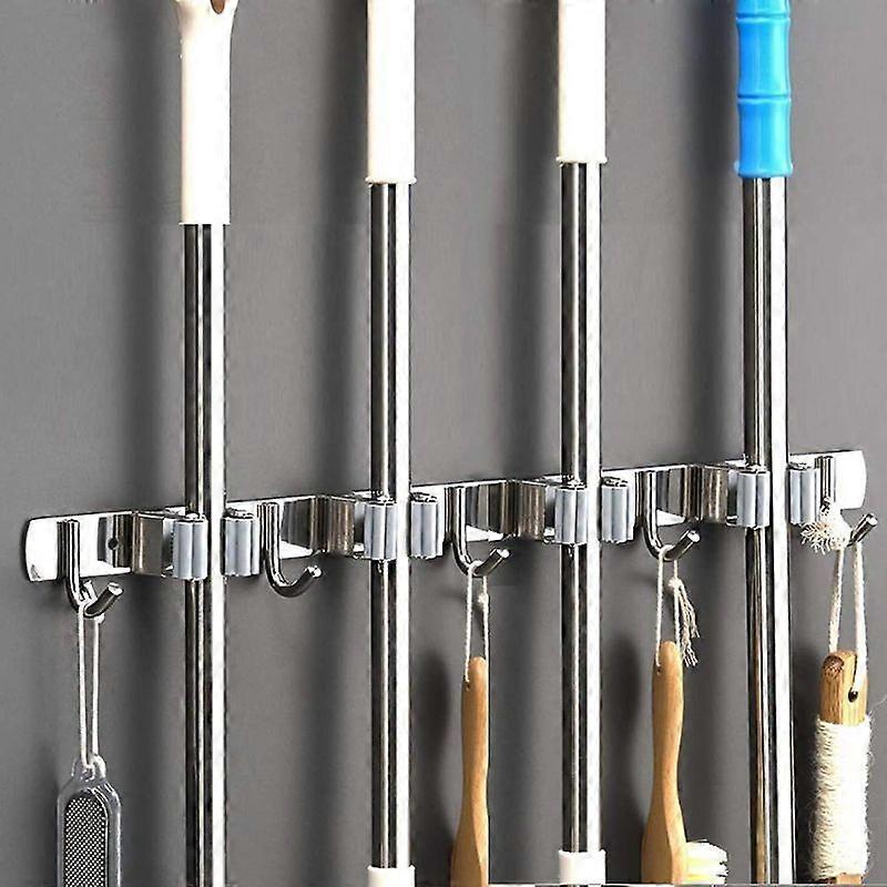 Luxora Wall-mounted Broom Holder - Stainless Steel Broom Holder, Storage Hanger Holder For Kitchen, Garage, Laundry Room (4 Locations And 5 Hooks)