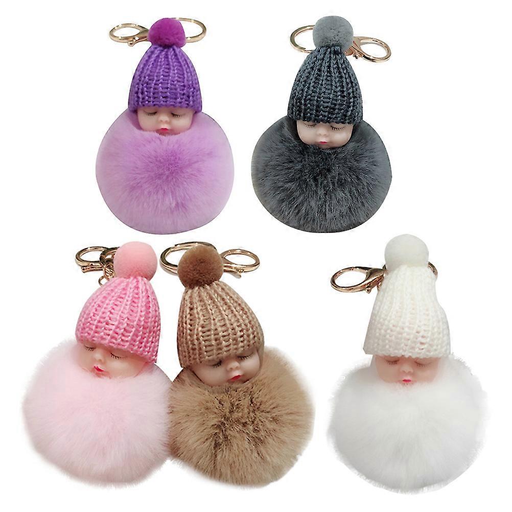 Keychain for Teen Girls Plush Ball Keyring Bag Attachment Little Girls White Pink Green Purple Dark Grey 5Pcs