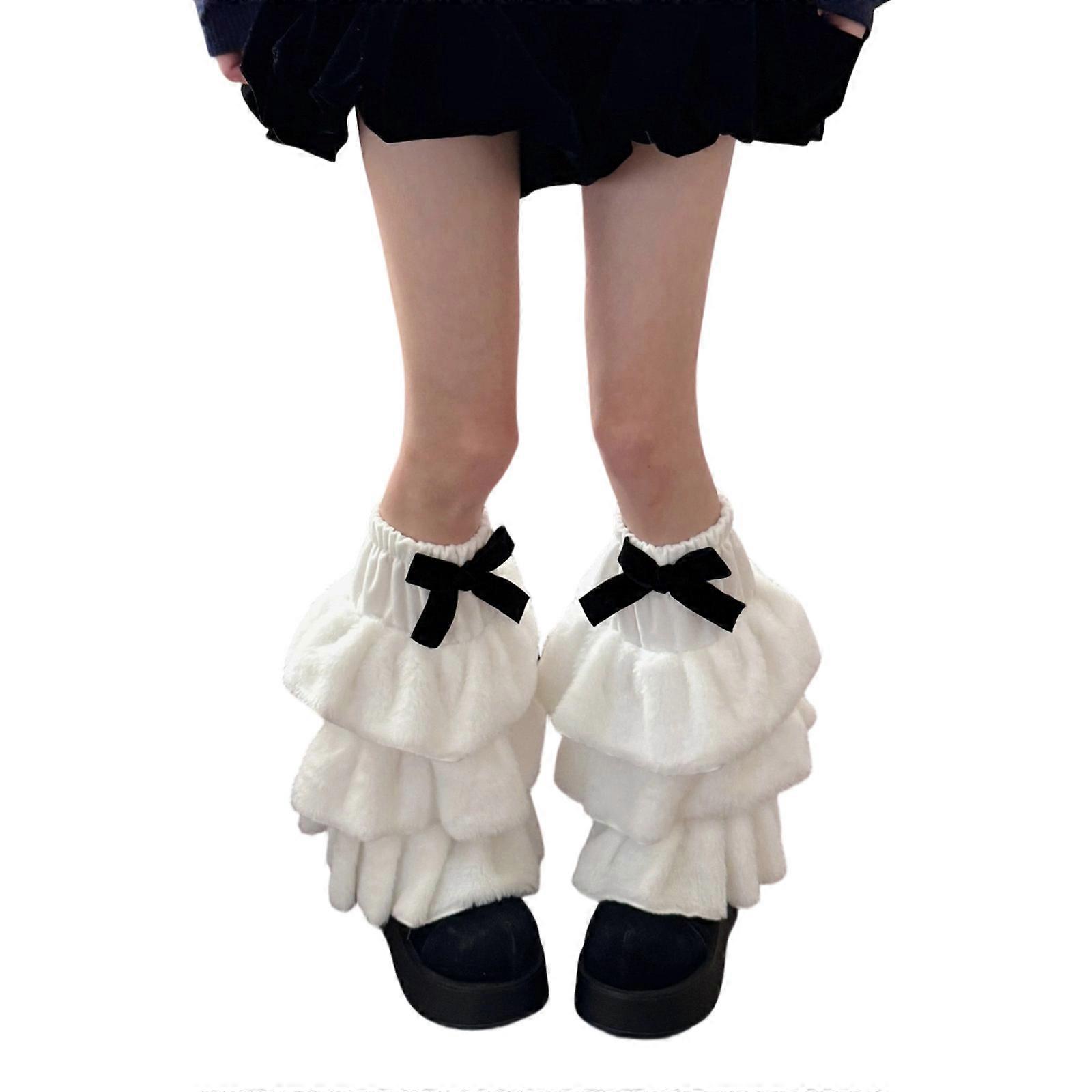 Fashionable Plush Tiered Ruffle Leg Warmers for Women Thick Thermal Warm Furry Boot Covers Socks with Bowknot Accent White