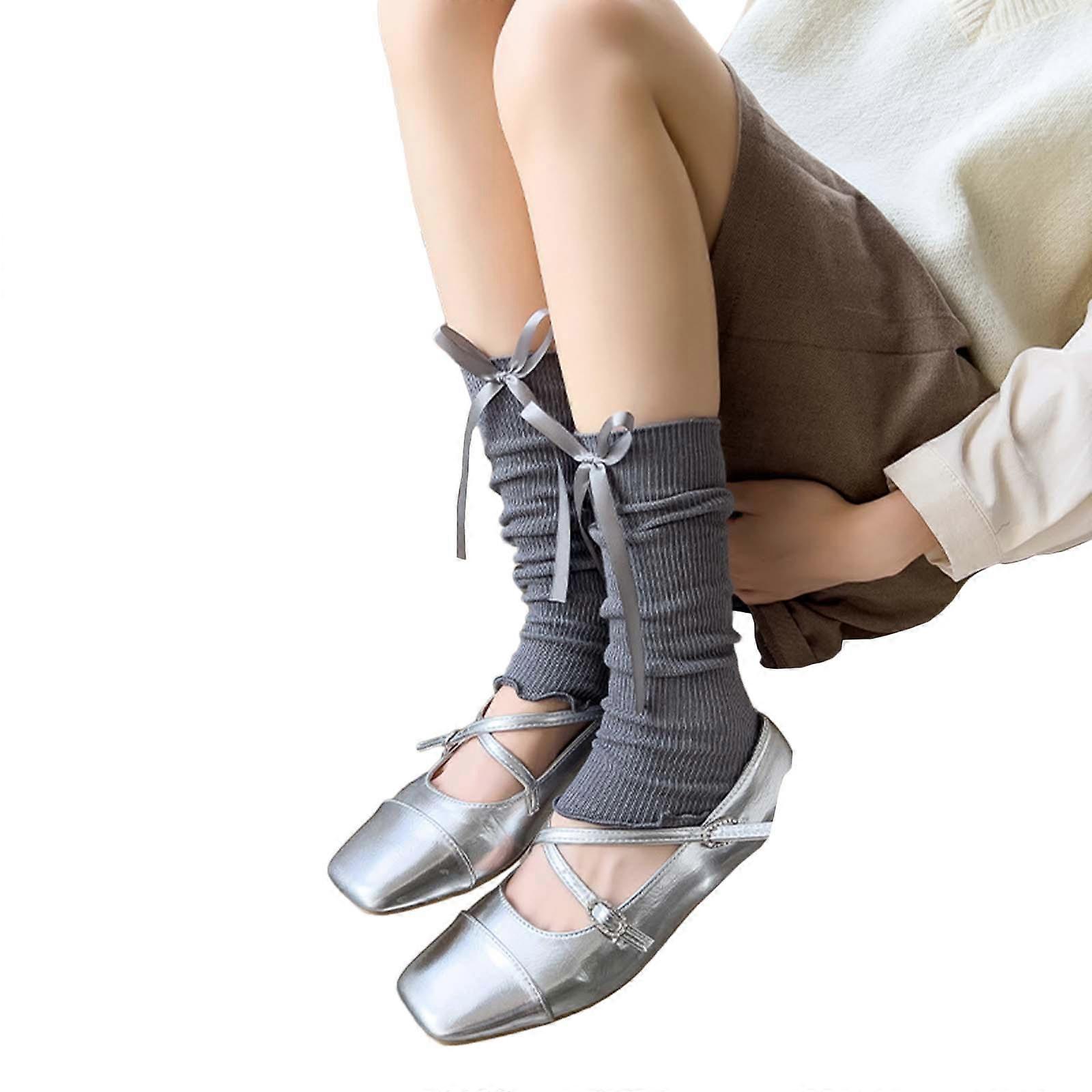 Knit Winter Warm Leg Warmers Long Socks Boot Cuffs Ribbed Leggings Stockings Bowknot Knee Warmers Sleeve light grey One Size
