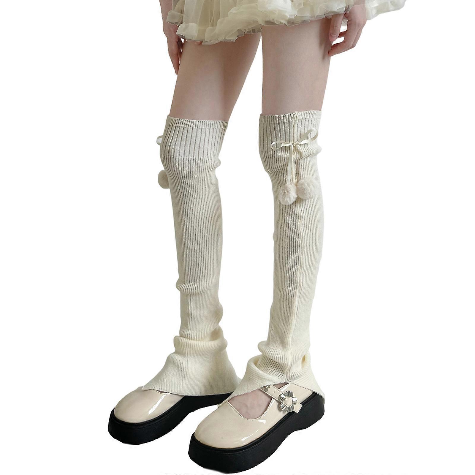 Thigh High Acrylic Ribbed Knitted Leg Warmers With Furry Ball For Women Winter Over Knee Socks Nonslip Breathable Stockings Milky white