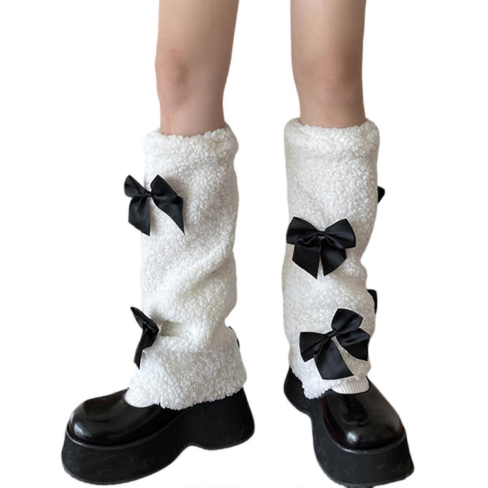 Winter Warm Bows Decorated Fleece Leg Warmers for Skirts or Shorts Women Faux Lamb Wool Fuzzy Plush Boot Covers Socks Multicolor
