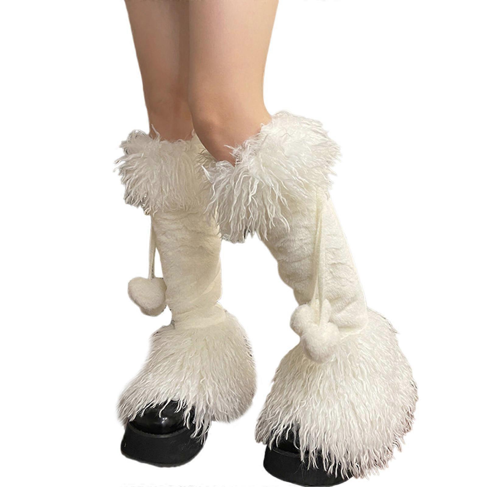 Fashionable Plush Leg Warmers with Sweet Heart Balls Bowtie Fuzzy Fish Tail Boot Covers for Women Furry Footless Socks White