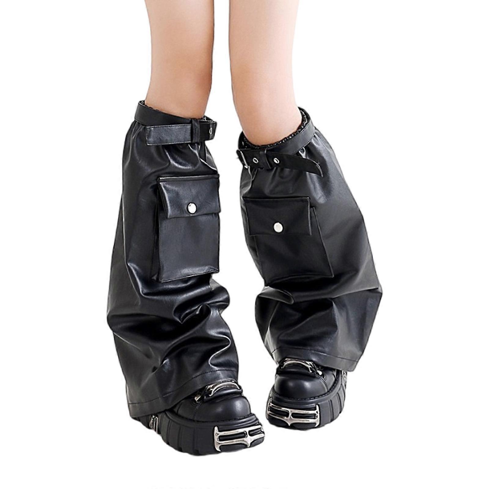Fashion Eyelet Belt Black Leg Warmers for Womens Harajuku Punk Faux Leather Baggy Boot Covers Flared Socks with Pocket Multicolor