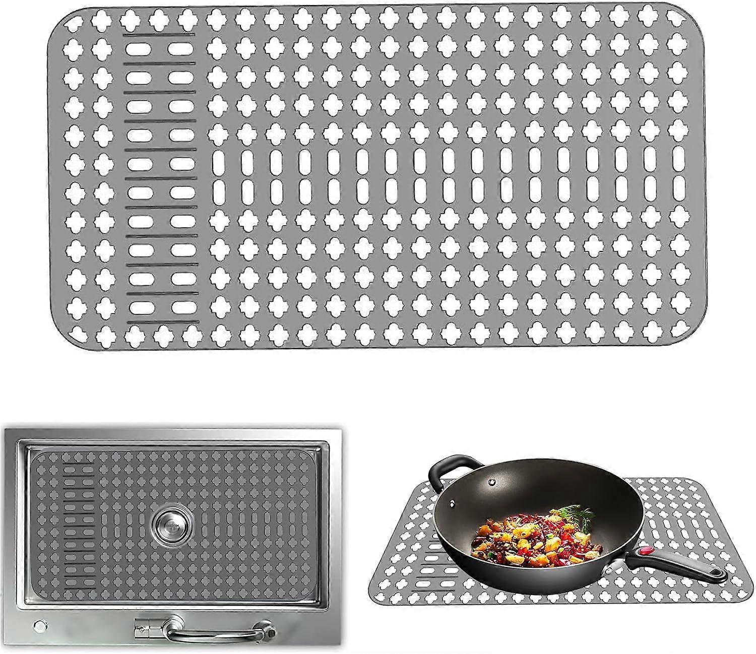 SAFE SILICONE MATERIAL: This grey silicone sink mat is made of high-quality silicone, which is durable and easy to clean. It effectively prevents mold growth, keeping your kitchen clean and hygienic. It's stain-resistant and extremely heat-resistant. It protects countertops and tables from hot pots or utensils and can therefore be used as a heat-resistant mat. QUICK DRAINAGE: The bottom of the silicone sink mat features honeycomb-shaped drainage holes and a raised design. This sink mat allows water to drain for better drainage and acts as a drying mat to help dishes dry faster. Kitchen countertop mats effectively prevent kitchen waste and dirt from flowing into drain pipes, preventing clogs. CUTOUT DESIGN: The unique cutout design of this kitchen countertop mat allows for quick drainage and faster air circulation, resulting in rapid drying of your dishes. Additionally, the pattern on the mat's surface helps prevent large food particles from accumulating, making cleaning easier. EASY TO CLEAN: This silicone sink mat is very easy to clean; simply rinse it with water or wipe it with a damp cloth. For stubborn stains, soak in soapy water and clean with a soft brush. It can also be easily cleaned in the dishwasher. It's easy to clean and doesn't take up much storage space. WIDELY USED: Made of environmentally friendly and healthy materials, this kitchen countertop mat can withstand temperatures up to 500°C. In addition to being used as a sink protector, it has versatile uses such as a drying rack, defrosting grid, etc. Furthermore, you can place heated pots and pans directly on the sink mat for added convenience.
