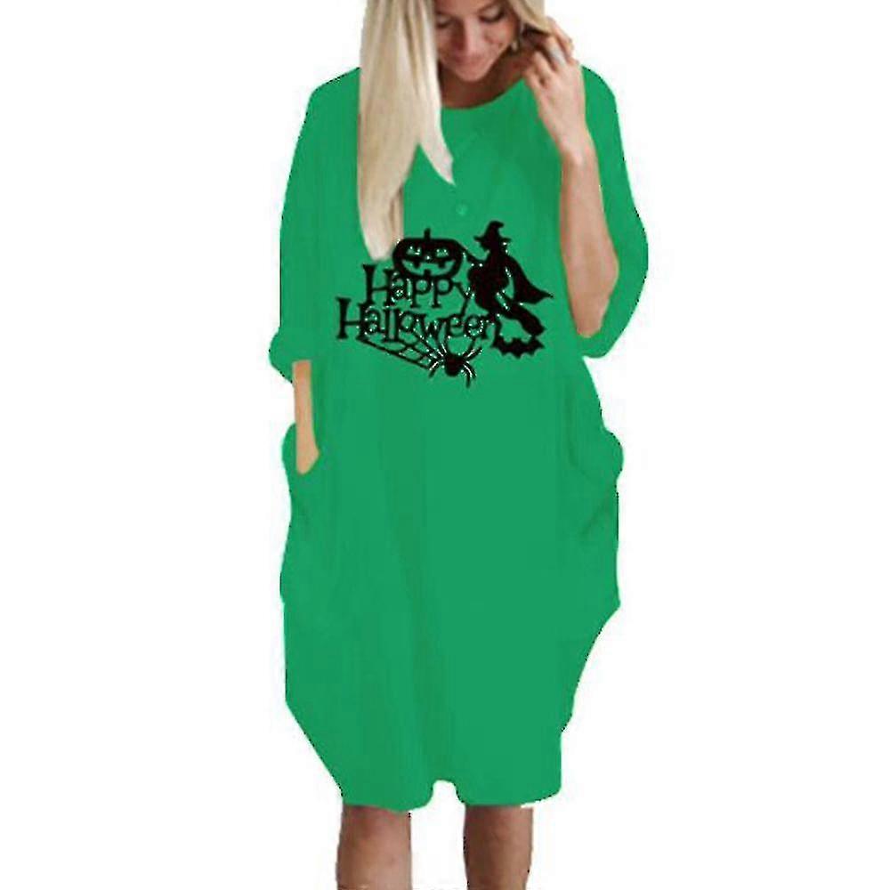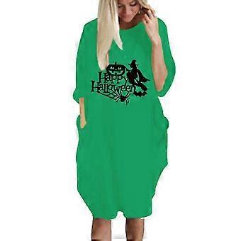 Plus Size Women Halloween Pumpkin Witch Printed Long Sleeve Pockets T-shirt Dress