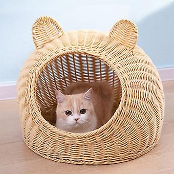 Cat Bed Cute Cat Ear Imitated Rattan Hand Woven Breathable All Seasons Washable Semi Closed Cat House for Indoor 45x45cm / 17.7x17.7in Beige