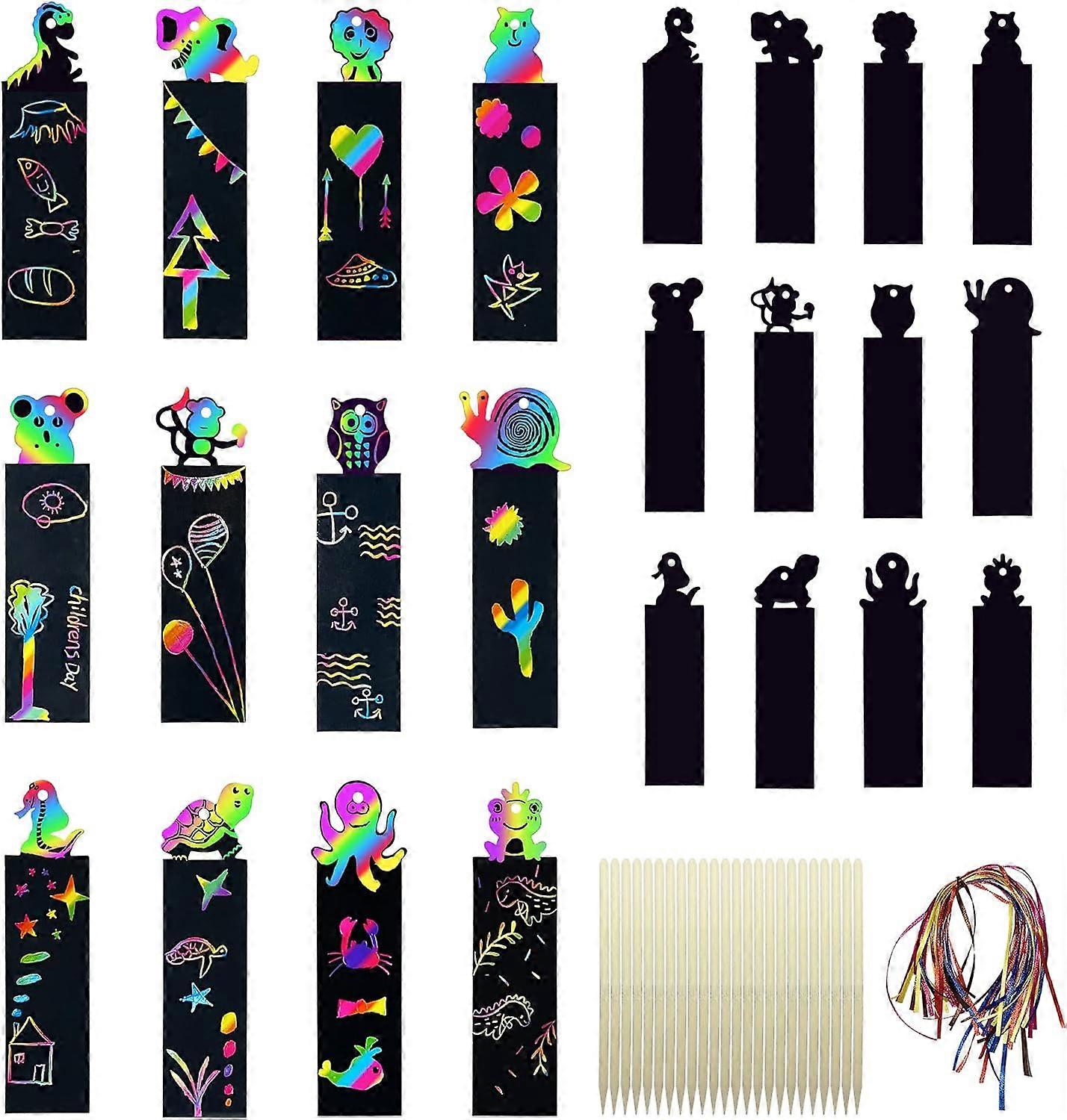 Party Bag fillers for Kids,24Pcs Bookmarks for Children DIY Paper Scratch Art for Kids Gift Tags with 24 Colorful Ropes and 12 Wooden Stylus