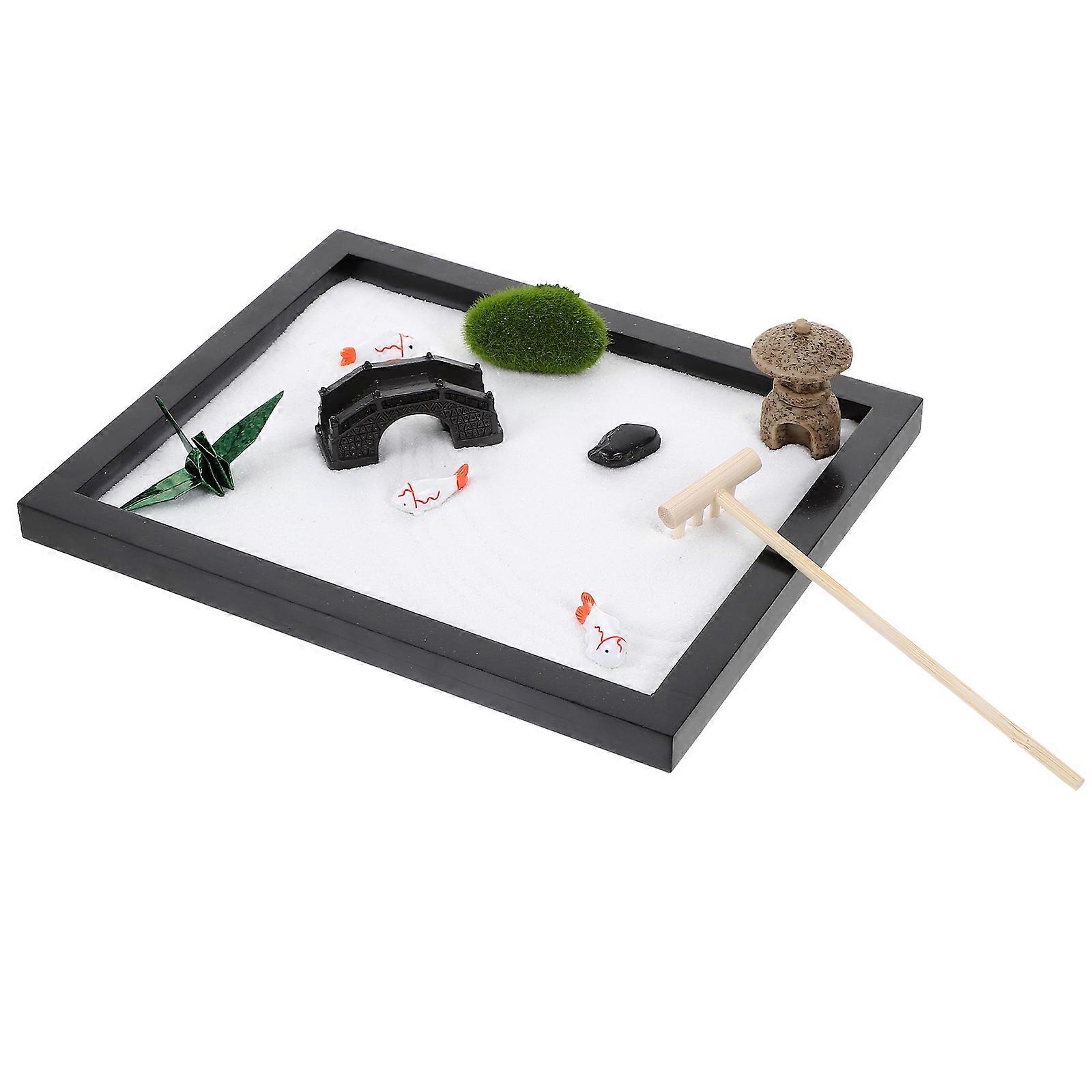 Description This Zen garden is more than just a great looking desk ornament. Zen Gardens offer a simple way to practice mindfulness meditation in a fun and engaging way. How? By simply taking a few minutes to focus intently on the sand and stones of this Zen Garden, you're taking a small break to clear your mind from the stress and anxiety of everyday life. That's it. Features - Color: Black- Material: Wood.- Size: 21.50X17.50X2.00cm/8.45X6.88X0.79in- This and sand decor comes with a subtle, elegant design guaranteed to impress everyone.- Mix and match it with other decor styles, creating a different fashion!- Use our miniature indoor garden as a fidget toy. Put it on the table. Now when you do something stressful, you can calm yourself by raking a sand garden.- Zen gardens are a great way to reduce stress and be more mindful.- Perfect for desks, bookshelves, and home decor.Packing list: 1 x Sand Table Ornament