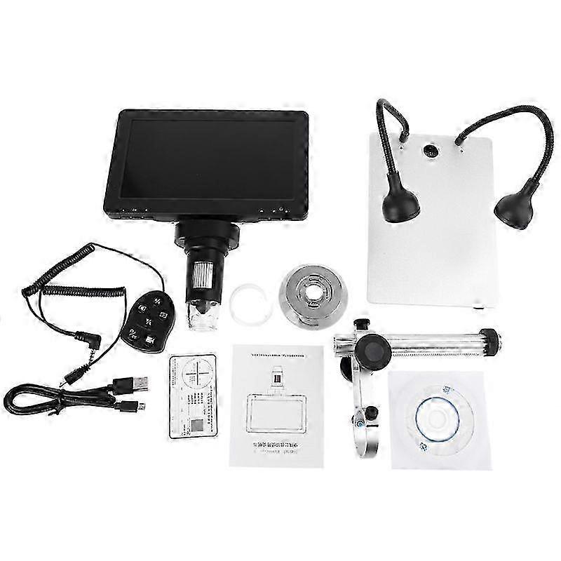 7 inch Digital Microscope 1200X 12MP Camera Magnifier Long Object Distance for PCB/SMD Repair Soldering with wire control Product model: DM9 Video resolution: 1080FHD 1080P 720P Pixel: 12MP Screen size: 7 inches Camera resolution: for 3M 5M 8M 10M 12M Supported languages: English, Portuguese, Japanese, French, German, Korean, Italian, Russian, Dutch, Arabic, Chinese Simplified, Chinese Traditional PC operating system: for Windows xp, win7, win8, win10, for mac OS x 10.5 or higher 6 advantages - 7-inch high-definition large screen, the for image is clearer - The screen can be rotated and the display angle can be adjusted up to 270 - The ultra-long working distance (Max.10cm) is conducive to spot welding by mobile phone maintenance, circuit board inspection, etc. - Remote button remote control - External fill light - Free reflector Applications: Circuit board inspection, Watch repair, Jewelry appreciation, Teaching and Research Tools, Textile testing, Skin detection, Printing verification, Coin identification Package included: 1 * Digital Microscope 1 * Bracket Stand 1 * Remote control 1 * Calibration card 1 * Reflector 1 * CD-Drive 1 * Manual (English)