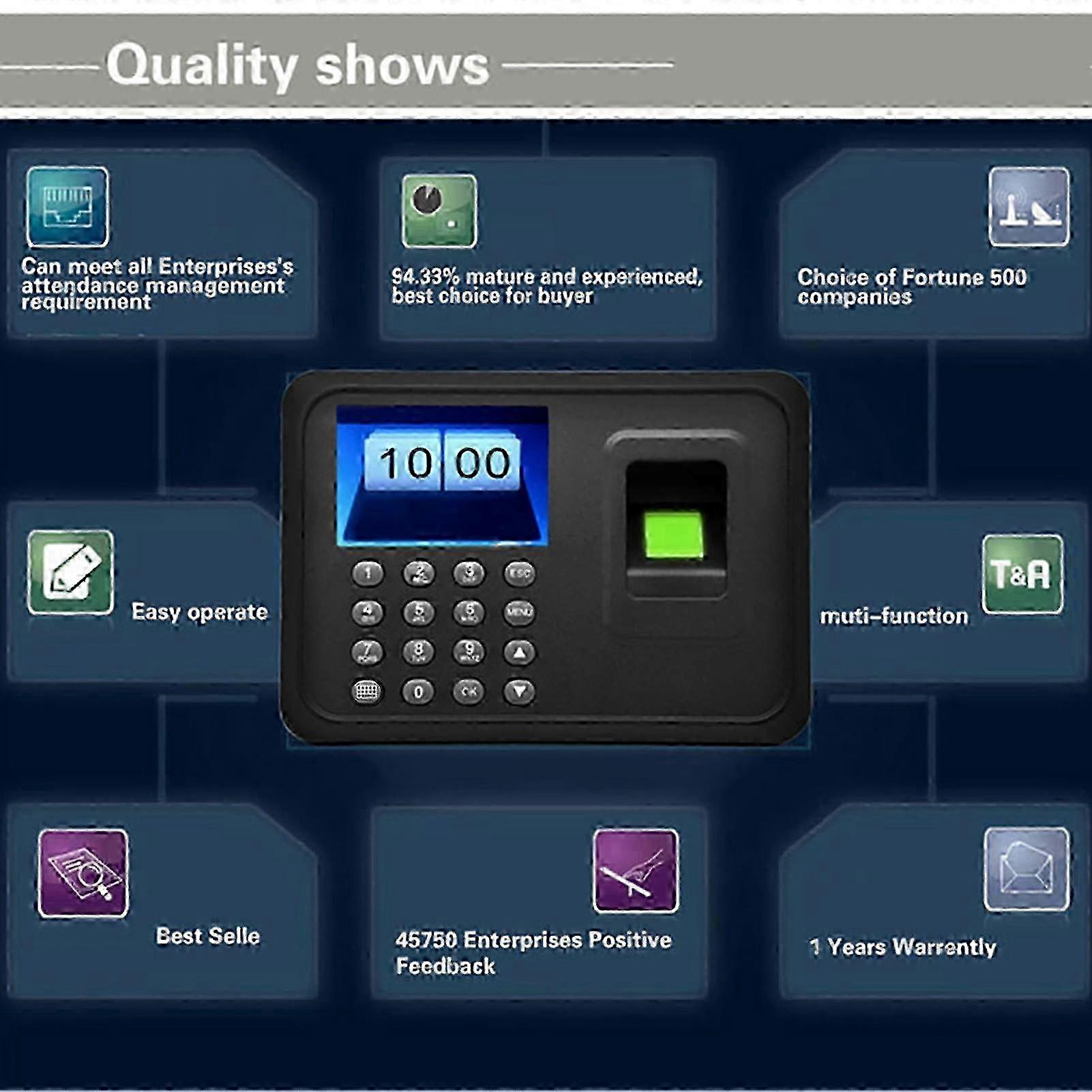 Time Attendance Machine 2.8inch TFT LCD Display Screen Fingerprint Attendance Machine for Office School<br> This machine is suitable for the employees attendances of office, factory, hotel, school, etc. It doesn't need any software and can be directly output attendance reports.<br> Specifications:<br> TFT: 2.4 inch TFT<br> Fingerprint Sensor:Energy saving Fingerprint Sensor<br> CPU: 32bit CPU<br> Fingerprint Capacity:1000<br> Log Capacity: 10,000 events<br> Communicate:USB<br> Identification Mode:Fingerprint, Password<br> USB Flash Drive Up/Download:Available<br> Input Method: T9<br> Record Query:Available<br> Identification Time:≤1s<br> FRR:≤0.01%<br> FAR:≤0.0001%<br> Operating Mode:Off line/Online<br> Language:English,Portuguese,Spanish,German,Italian<br> Voice Prompt:Available<br> Power Adapter:DC 5V<br> Operating Environment Operating Temperature: 0℃ ~ +60℃<br> Humidity(RH):20%~60%<br> Package Size: About 25.5*14.5*5cm<br> Package Weight: About 450g<br> Note: Due to the light and screen setting difference, the item's color may be slightly different from the pictures. Please allow slight dimension difference due to different manual measurement. Sold by-YJL official store