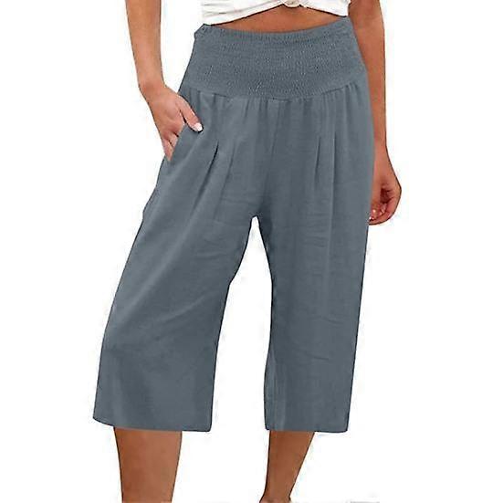 Women Cropped Pants Elastic Waistband Casual Solid Color Pants with Pockets Wide Pleated Wide Leg Mid-calf