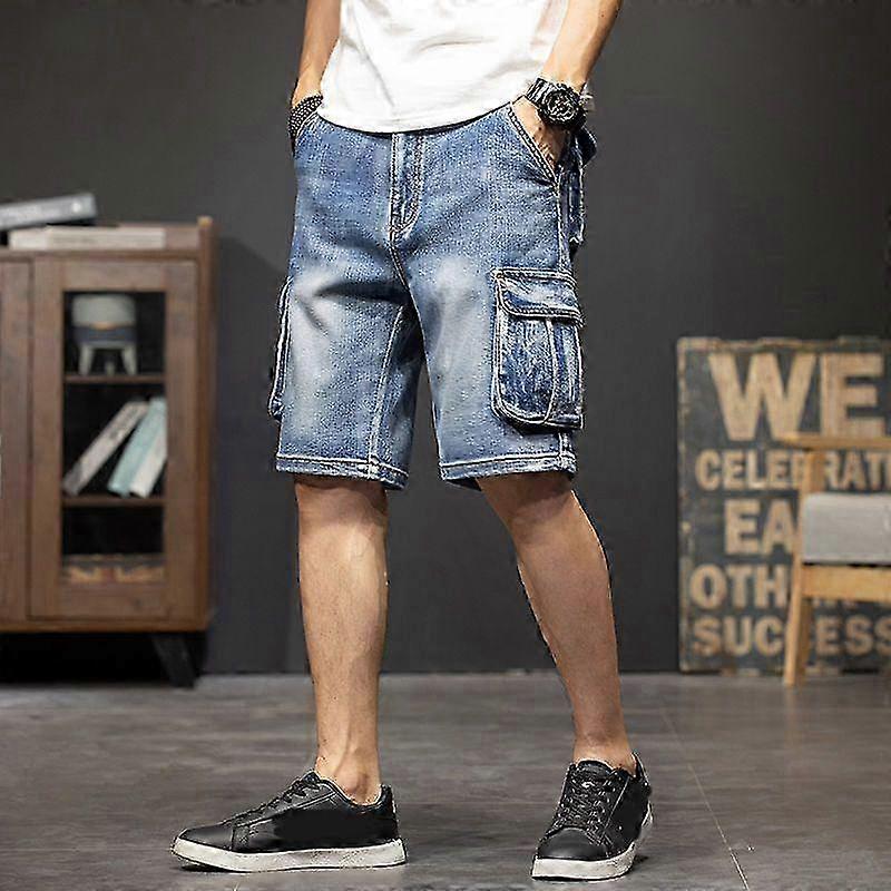 Men Jean Shorts Vintage Biker Motorcycle Hip Hop Cropped Multi Pockets Denim Cargo Shorts Plus Size 25-26s