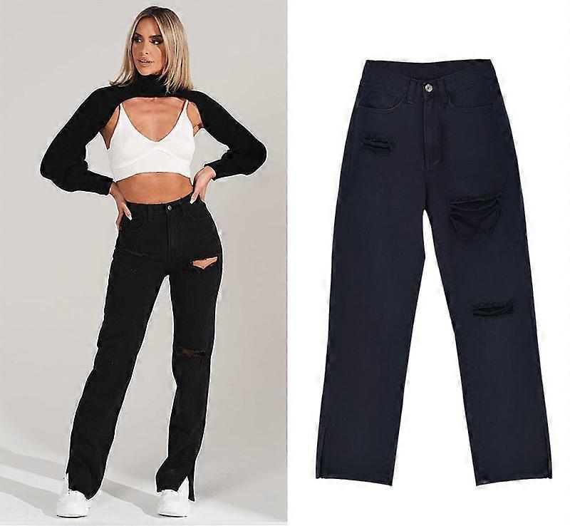 Women's Solid Color Ripped Denim Trousers Casual Jeans Pants With Pockets