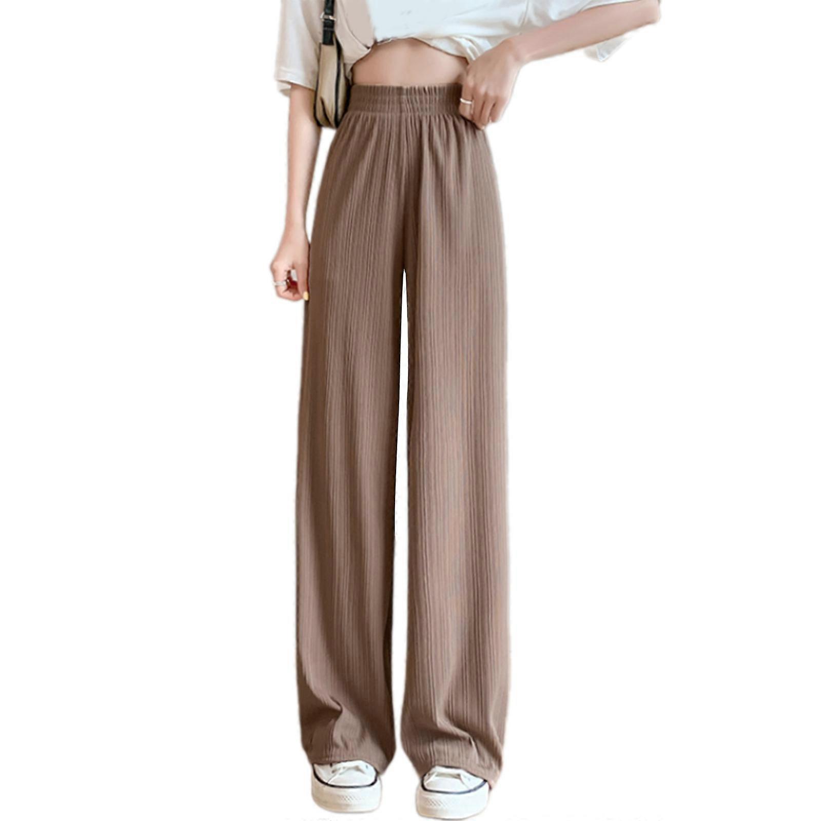 Women's Summer Ice Silk Pants High Waist Wide Leg Pants Full Length Dress Pants Loose Casual Trousers Palazzo Pants Khaki XL
