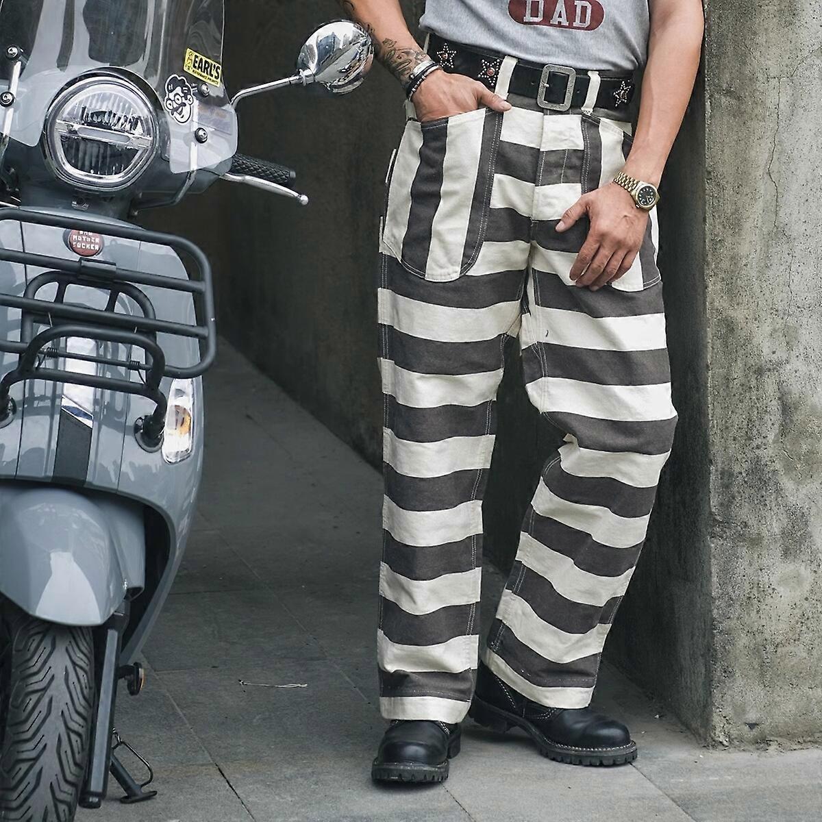 Prison Stripes Pants Vintage Style Motorcycle Biker Casual Trouser Men