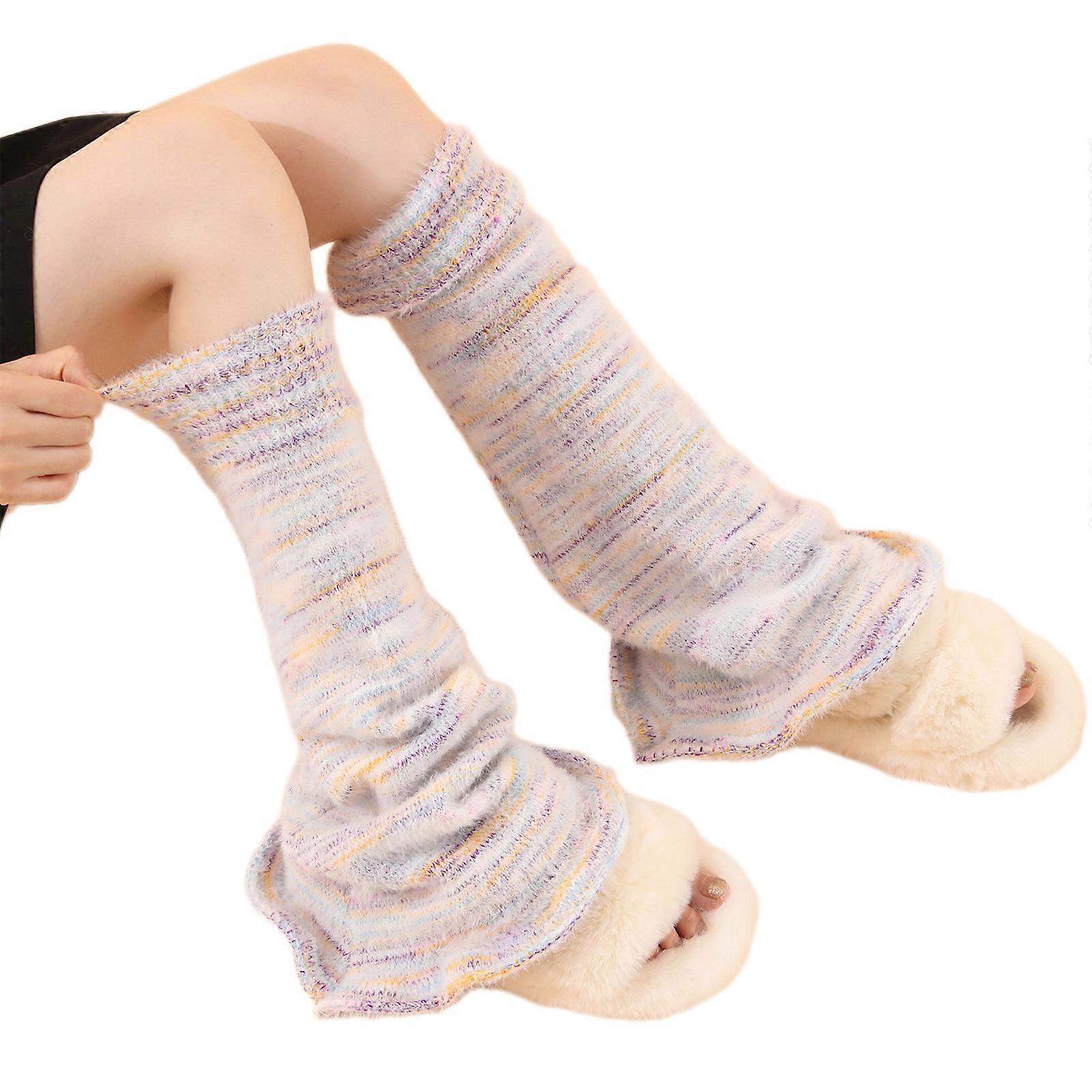 Flared Hem Leg Warmers Women JK Girl Harajuku Furry Knit Colorful Stretchy Knee High Leg Cover Boot Cuffs Long Socks Purple yellow