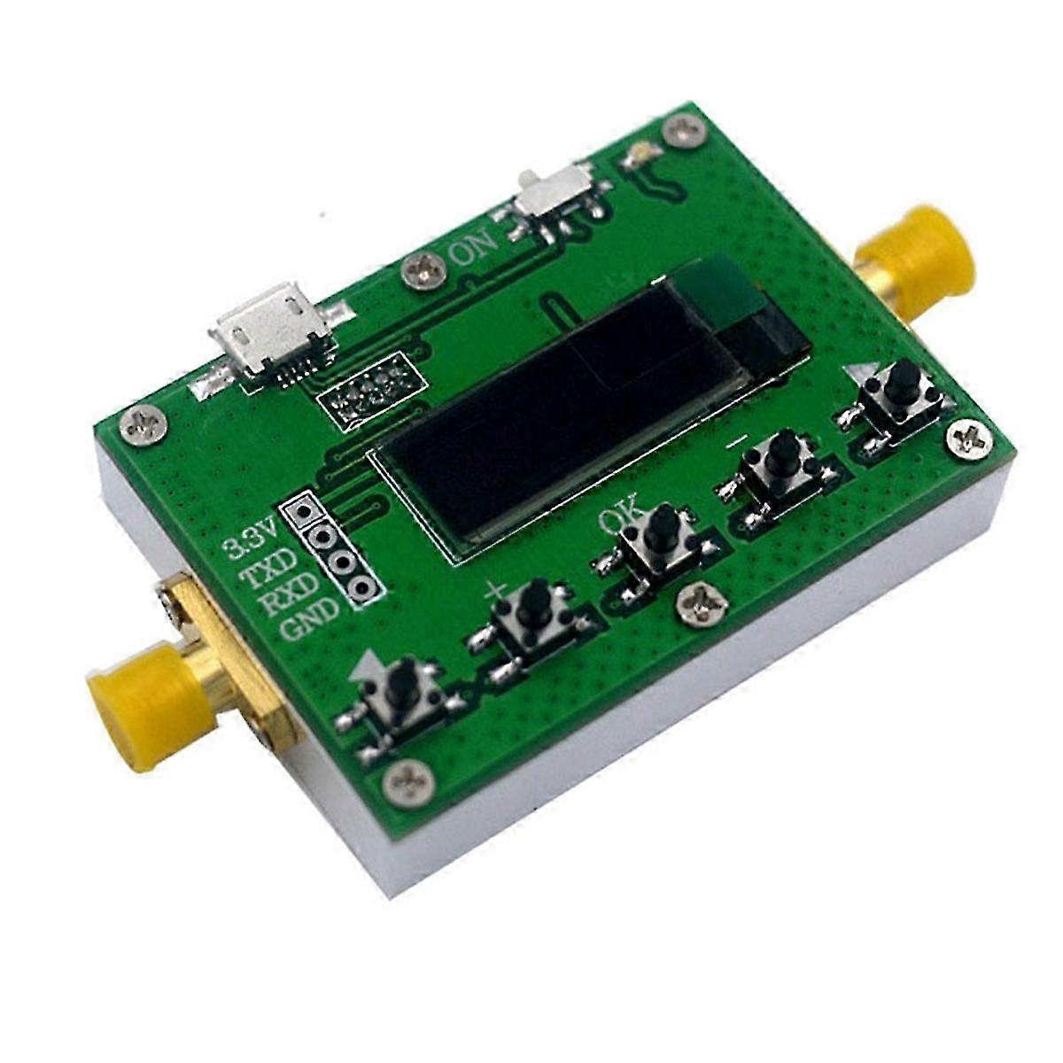 The digital attenuator can adjust the signal level of the circuit in 0.25dB steps without interrupting the circuit.It can also be used as an in-machine attenuator for instruments and equipment to adjust the power level in the test system.It has a small size. , high precision, stability and reliability.It uses OLED to display the attenuation, and the attenuation can be controlled by the host computer. Technical indicators:1. Working frequency: LF-6GHz2. Attenuation adjustment range: 0-31.75dB3. Attenuation step: 0.25 (dB)4. Insertion loss: 1.5dB (the insertion loss at the high-frequency end be larger)5. Standing wave ratio: 1.46. Attenuation accuracy: 0.25dB Max7. Rated power: 1W8. Connector form: SMA (female, external thread, internal hole)9. Temperature range: -10~+50 (operation)-40~+70(not operating)10. Overall dimensions: 55 x 40 x 16.5mm (excluding the protruding part of the SMA interface, the protruding part of the SMA is 9mm)11. Weight: 57g12. Input and output impedance: 50 ohmsDue to different batches, the appearance, color and printed words of the product , which not affect the use.Material: PCBcolour: green Package Contents:1 x Digital Attenuator Only the above package content, other products are not included.Note: Light reflection and different displays may cause the color of the item in the picture a little different from the real thing. The measurement allowed error is +/- 1-3cm.