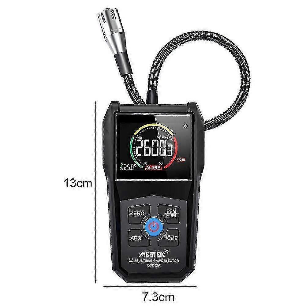 Air Analyzer Gas Leak Detector Gas Analyzer Sound Alarm PPM Meter Combustible Gas Flammable Natural Tester 50000 PPM 100% LEL Small size and light weight. Double body protection, safer operation, easy to carry. Color: Black Material: Plastic + metal Size: 13*7.3*3.3cm Specifications: Item Name: Gas Detection Alarm Quantity: 1 DIY Supplies: Electrical Gas Type: Combustible Gas With LCD Display Or Not: Yes Is Smart Device: No Measuring Range: 0-50000PPM / 0-100%LEL Measure Gas: Combustible gas, natural gas, coal gas, methane,Ethane CGD02A: PPM/LEL% CGD01: Only LEL% LCD Screen: Only CGD02A Alarm Mode(CGD02A): Sound alarm and Analog column Accuracy: 1PPM / 1%LEL Preheat Time: 30 seconds Calibration Method: Auto Calibration after 30 seconds Auto Power-off: 10 minutes after no operation Working Current: 190mAh Temperature Measure Range: 0-50 degree/32-122F Celsius and Fahrenheit Switch: Only CGD02A Working Temperature: 0-50 degree Working Humidity: 0-70%RH Flexible Hose: 270mm Usage 1: Combustible Gas detector Note: -There might be little error of size for manual measurement. -The colors deviation might differ due to different monitor settings, please kindly understand. Packing list 1*Tester 1*Cloth Bag 1*Manual