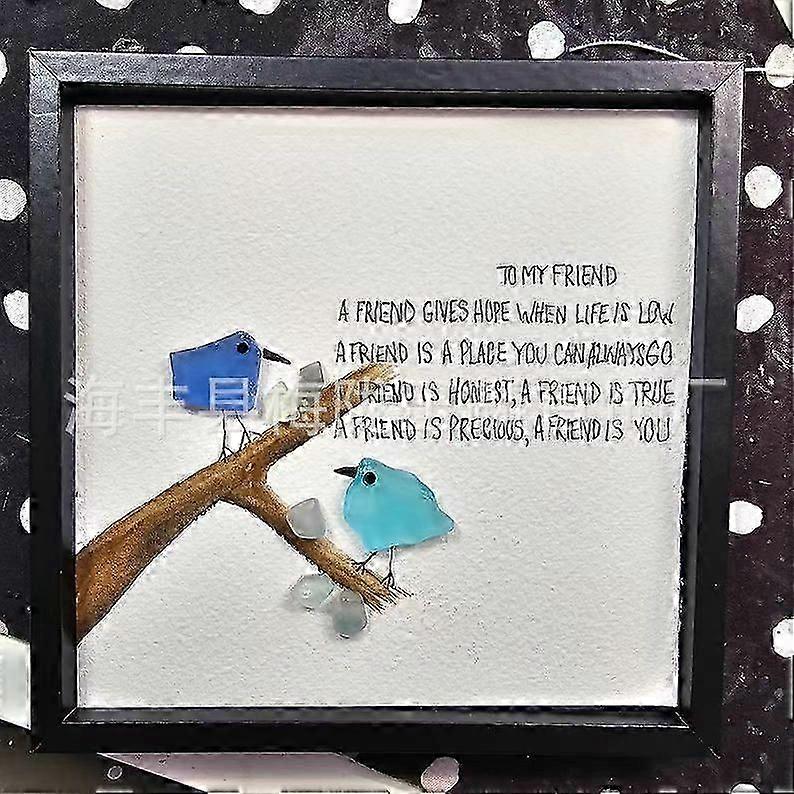 Sea Glass Birds Photo Frame, Photo of 2 Birds Standing on Branch, Sea Glass Art Wall Decor with Wood Frame for Home Room Office Wall Decor