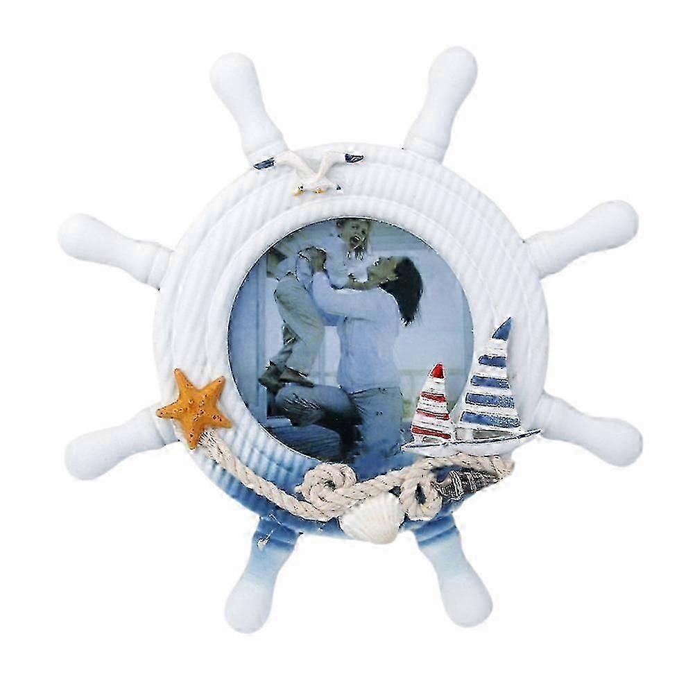 Mediterranean decor photo frame with handcrafted boat steering wheel