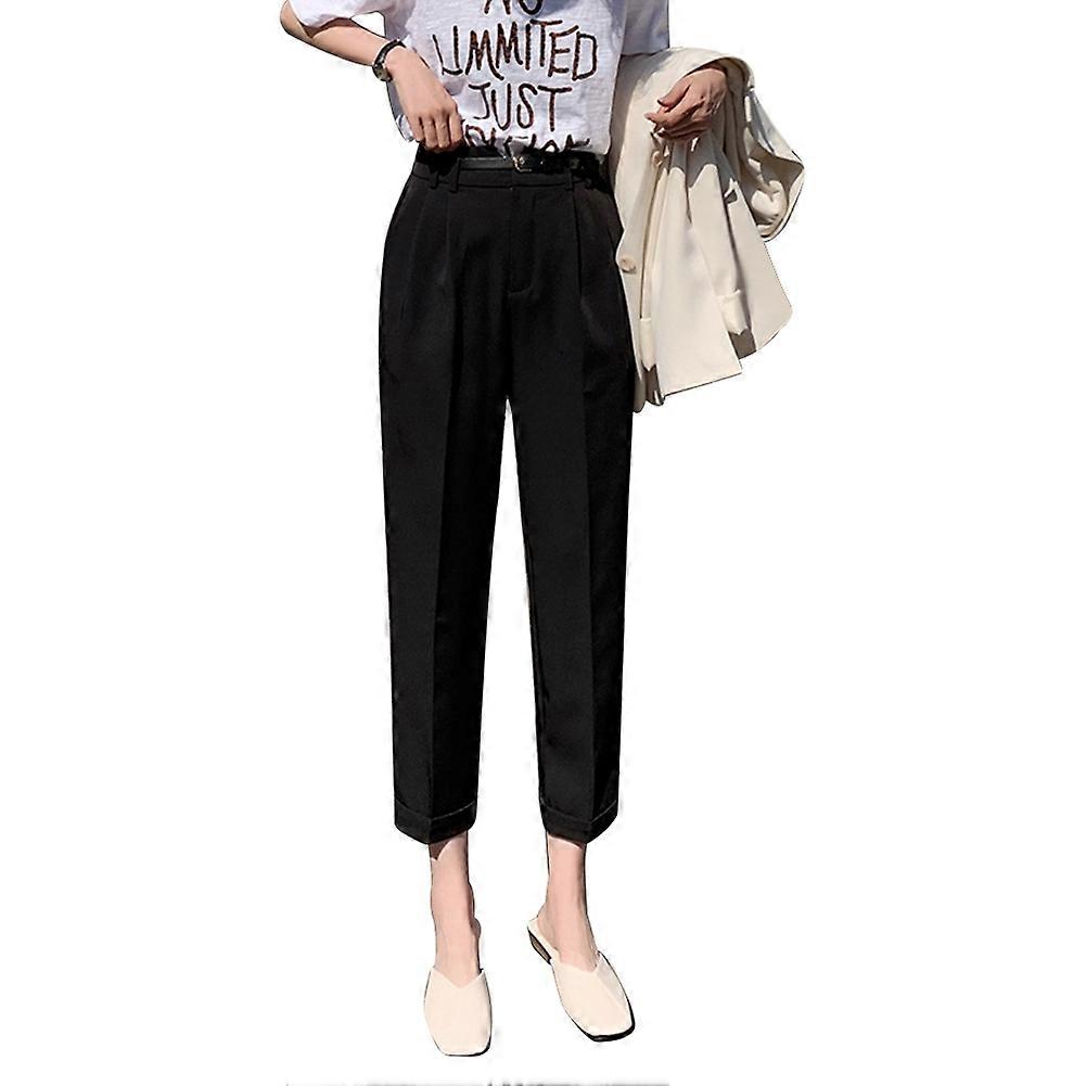 Stylish Women Solid Color Straight Leg Cuff Loose Suit Pants Casual Ninth Trousers(Black, M)