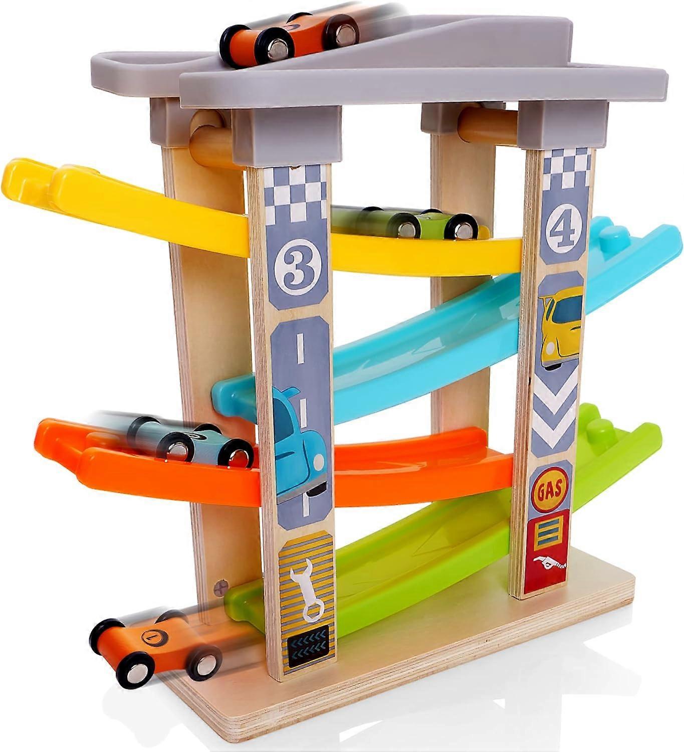 Wooden Car Ramp Racer Track - Toy Cars For 1 - 2 Year Old Boys - Wooden Car Toy Garage With 4 Racing Cars - Gifts For Boys Age 18 Months +