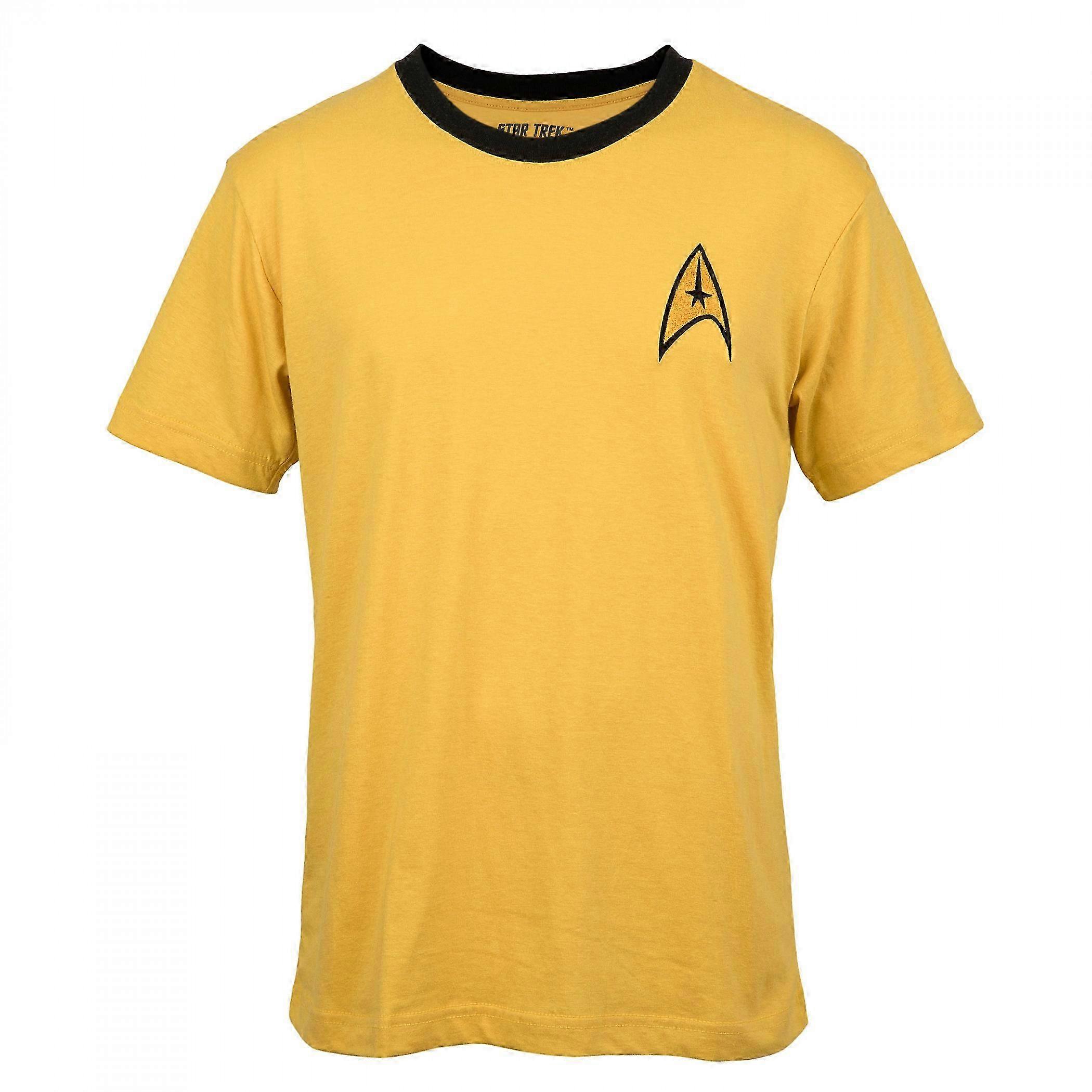 Now you can suit up like Captain Kirk this Halloween with the help of this officially licensed Star Trek Captain Kirk Badge T-Shirt. This yellow Star Trek is made from cotton and features the iconic Captain Kirk Badge printed on the front. All sizes are US sizes.