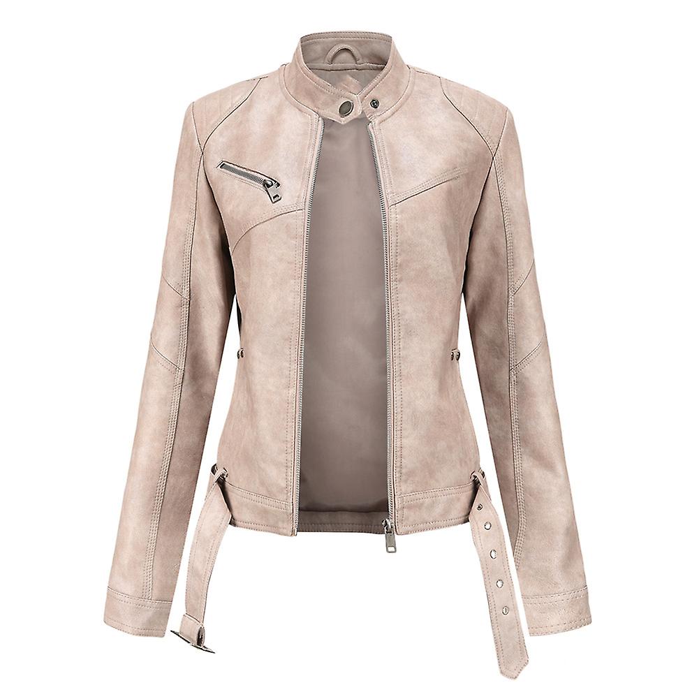 Allthemen Womens Classic Casual Stand Collar Slim Belted Leather Jacket