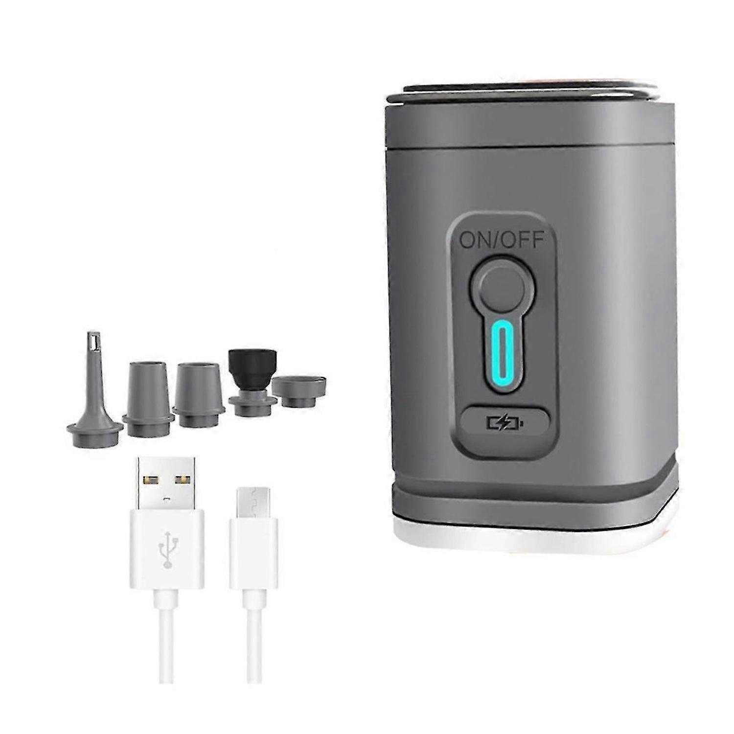 Description:[Compact and ]The portable air pump is mini and light-weighted, you can be put in a backpack or pocket, and there is a storage pouch inside the kit which you can use to install the air nozzle and USB cable, the pool float pump takes up very little space and you can easily take it with you, 't add too much to your package burden. It's a great camping gear. [Powerful In/Deflation] Powerful 4kPa air pressure and fast 200L/min wind speed make inflator air pump can quickly inflate & deflate. According to our experimental data, when fully , our electric air pump to inflate 3-4 inflatable bed, 5-6 single camping air mattress, 15 swim rings, or deflate 15-16 storage bags. [USB Rechargeable air pump]This cordless air pump equipped with 1200 mAh battery capacity, which can work up to 15 min after fully . The fast type-c port supports 4 ways of charging: power bank, laptop, car charger, or power adapter. [5 Nozzles & Diverse Use]Our travel air pump comes with 5 different nozzles, which can fit most of small-large sized inflatable air products. So this battery air pump is suitable for indoor and outdoor year-round use. Summer: pool floats, swim rings; Winter: Snow Tube PVC Inflatable Sled; Outdoor: air mattresses, sleeping pads, inflatable beds; Indoor: inflatable furniture, Yoga balls, Pilates balls and other inflatable toys. [Led Camping Light & Emergency Light]This small air pump has two levels of dimming and is also an emergency light. When you press and hold for 3s, the light turns on, press it again to turn it into a strong light, and press it again to turn it into a flashing light (SOS mode). It also has a hook, you can easily hang it on the tent or where you need light<br><br>Material: Plastic colour: Gray<br><br>Package Contents: 1 x Inflation Air Pump 5 x Gas nozzle 1 x USB Cable<br><br>Only the above package content, other products are not included. Note: Light reflection and different displays may cause the color of the item in the picture a little different from the real thing. The measurement allowed error is +/- 1-3cm.