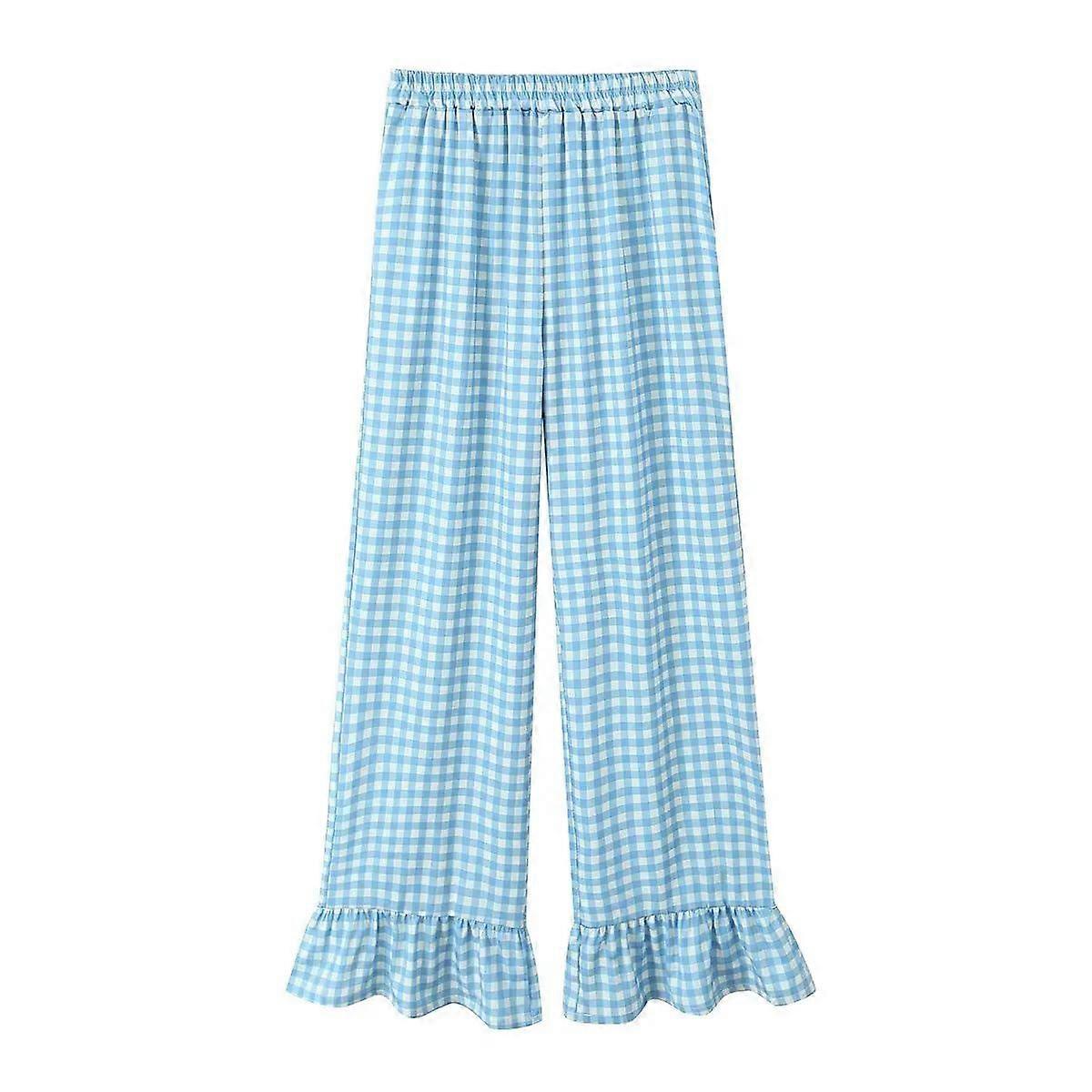Plaid Ruffles Edge Flare Pants Women Elastic High Waist Wide Leg Spring Summer All-match Female Trouser