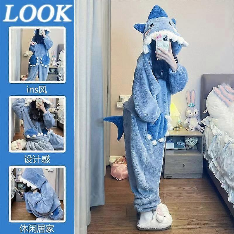 Sweet Cute Shark Hooded Coral Fleece Pajamas Winter Warm Onesie Homewear for Adults