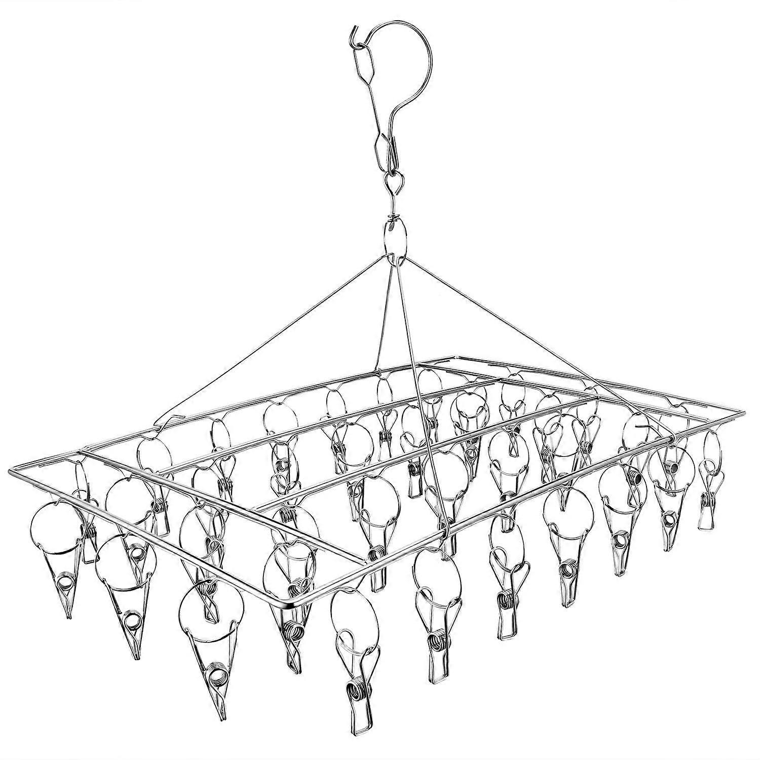 UPDATED VERSION, REINFORCE SOLID STAINLESS STEEL. Bold Rack, Anti-rust, Durable with long lifespan. Unlike other plastic or hollow steel version which will be damaged easily by sunshine or extrusion PRACTICAL ANTI-LOST DESIGN. 360rotation. Windproof Large top hook can hang on any closet rod or clothesline. Super strong pegs hold your socks and underwear tight. Always keep your washing safe to avoid being blown away ESSENTIAL AND USEFUL. Suitable to hang drying the socks, bras, cloth diapers, towel, underwear, shoelace, scarf, panties, gloves, handkerchiefs, baby clothes or other small size clothes MORE SANITARY FROM SEPERATED PEGS, such as socks and underwear, women and men, adults and children SQUARE HANGER SIZE (36 pegs): Approx 42(L) x 30(W) x 28cm(H). Warm Tip: 1 - Do not hang the rack outdoor in wet wheather. 2 - Keep dry and clean, wipe regularly