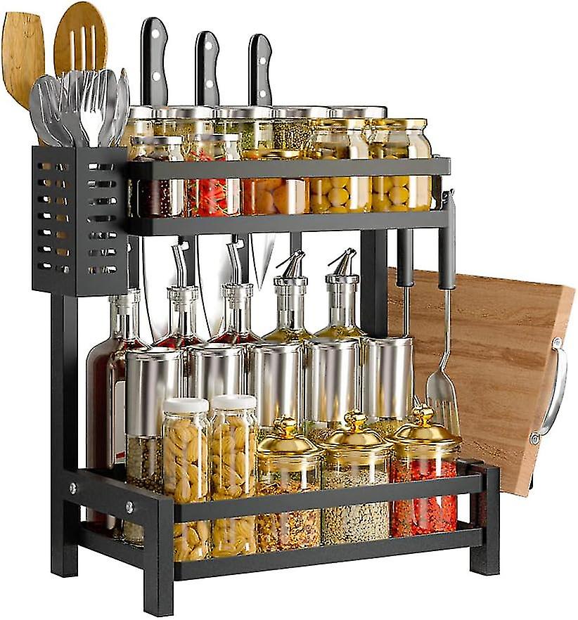 Tier Spice Rack, Stainless Steel Kitchen Storage Spice Rack, Countertop Kitchen Organizer With Utensil Holder, Cutting Board Holder, Black