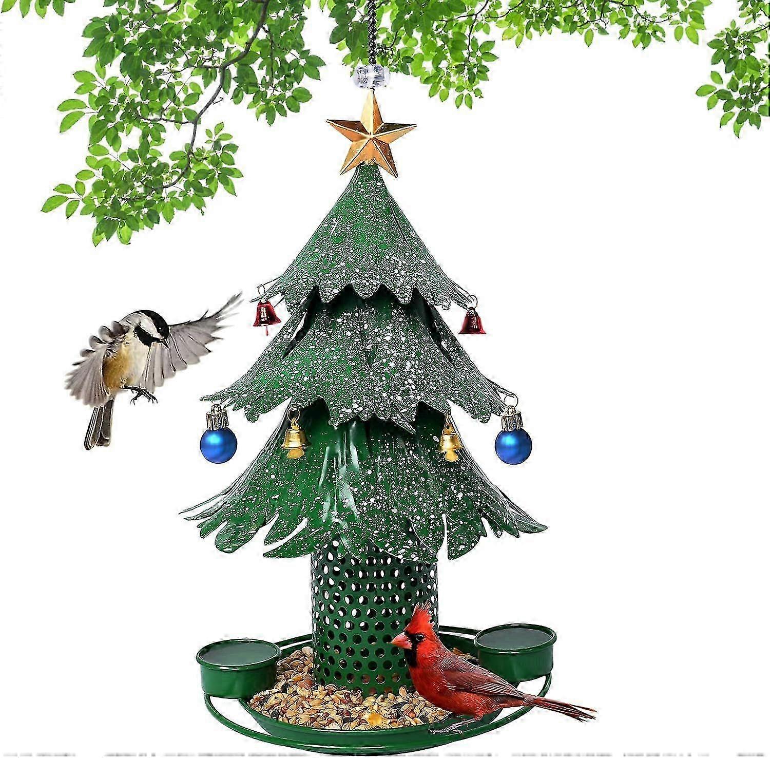 Breathing new life into spring.: 2023 new bird feeder. Delicate Christmas tree shape, bright golden five-pointed star, and snow-green Christmas leaves create this novel bird feeder.Each of our Christmas tree bird feeders are carefully handcrafted by artisans. It's not just a Christmas Tree bird feeder, it's a tree of life.Breathing new life into spring.A good choice for present. DIY Christmas Centerpieces: There are 10 holes reserved on the leaves of the Christmas tree bird feeder for you to DIY various christmas decor, our supply 4 pairs of christmas bell are equipped for you with decoration. It is suitable for adding a festive atmosphere to various festivals such as Christmas and Thanksgiving.beautiful decoration for your garden. : The bird houses feeder for outside is an all-metal structure, and the metal surface is coated with an anti-rust coating. Professional automatic paint, more rust-proof. Thicker metal shell, more durable. Thickened catenary, more load-bearing. which is all chew-proof.1.5 lb high capacity bird feeder. and the Bird clip-lock lid prevents wild animals from opening the lid and stealing the seeds. Simple and Easy to Use: The bird feeders for outdoors hanging is designed to be easily assembled and disassembled by hand without any tools. Simply unscrew the plastic cap to remove the lid and fill it with seeds or nuts . The bird feeders for outside is available for feeding and also comes with two drinking cups for the birds to drink. There is a circle of perches on the periphery for feeding wild birds with a 360-degree panoramic view, which is extremely convenient. Rainproof design: The leaves of the Christmas tree protect the birds from the rain, and three drainage holes are designed on the chassis, which can drain the rainwater in time and ensure the drying of the bird food. The three large-diameter steel balls on the chassis make the bird food flow out smoothly. In addition, the natural color of the tree attracts birds. such as cardinal, red finches, tits, golden finches, blue jays.and more.It is a good product for bird feeding and bird watching. Note: Due to the light and screen setting difference, the item's color may be slightly different from the pictures. Please allow slight dimension difference due to different manual measurement.