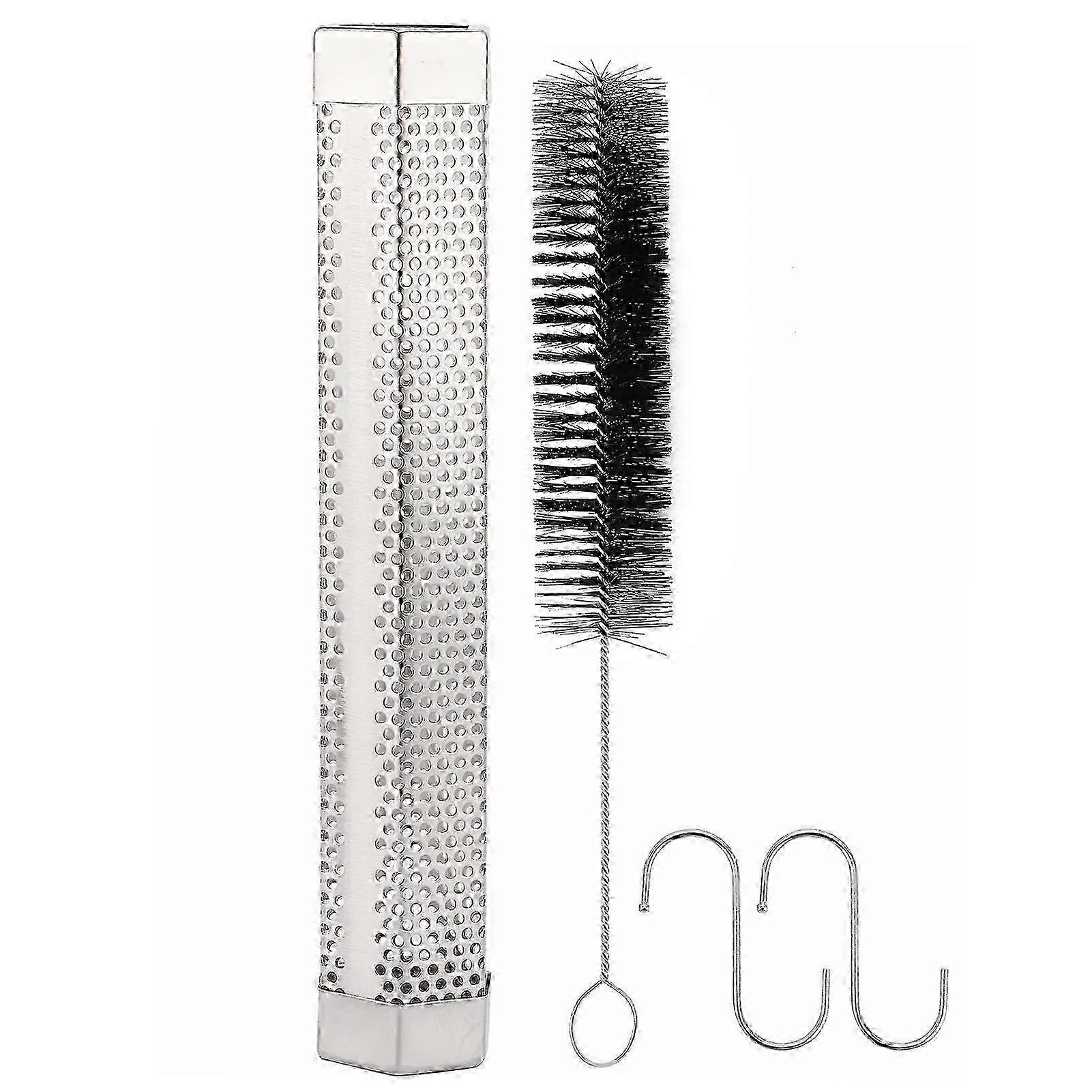 1It adopts a hexagonal column design to maintain stability and will not roll on the grill. 2It can be used with cherries, pecans, mesquite shrubs, and other wood pellets to increase the taste. 3Dense vents can spread the smoke evenly and fully burn to provide a constant smoke. 4Enlarge the capacity of the smoking tube, fill it with enough particles, and it can be smoked for up to 5 hours. 5Thickened 304 stainless steel, no rust, no deformation, durable, direct contact with food, nontoxic no smell. 6Multifunctional smoker tube, can be placed in any grill and smoker, suitable for hot and cold smoked meat, cheese, nuts, etc. 7Equipped with a cleaning brush and a pair of hooks. The cleaning brush can clean the excess carbon dust in the tube. The hooks can hanging the tube on the grill or hanging it for storage. 8The smoking tube is light in weight, easy to carry and easy to maintain, suitable for family or outdoor barbecue. Item Type: Smoker Tube Material: 304 Stainless Steel Color: Silver Smoker Tube Size: Approx. 31x5cm / 12.2x 2.0in Thickness: Tube Body: Approx. 0.7mm / 0.03in, Tube Edge: Approx. 0.5mm / 0.02in Brush Size: Approx.29x4cm/ 11.4x 1.6in Hook Size: Approx.9x4cm/ 3.5x 1.6in Weight: Approx.301g/ 10.6oz Application: Smoked food; The smoky flavor of meats, cheeses, nuts, etc Smoke step Step 1: Fragrant wood filled with smoked tube Step 2: Let it catch fire and burn for 3-5 minutes Step 3: Blow out the flame, place on the grill 1 x Smoker Tube 1 x Brush 2 x Hook 1. Please allow 1#8209;2in error due to manual measurement. Thanks for your understanding. 2. Monitors are not calibrated same, item color displayed in photos may be showing slightly different from the real object. Please take the real one as standard.