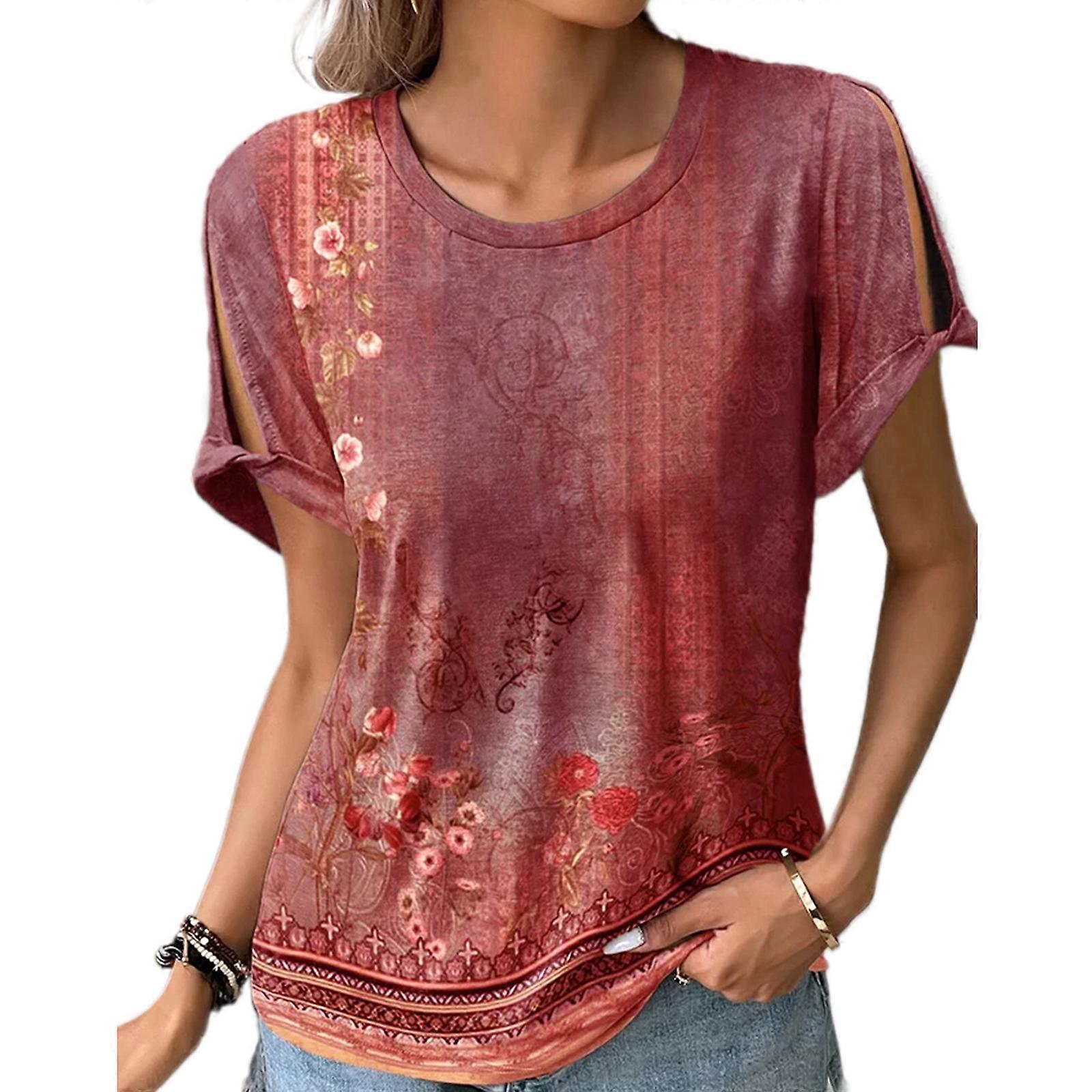 Female Short Sleeves Tee Top Women Ethnic Floral Print T-shirt Crew Neck T-shirt Slim-Fit Casual T-shirt Top for Summer Red XL