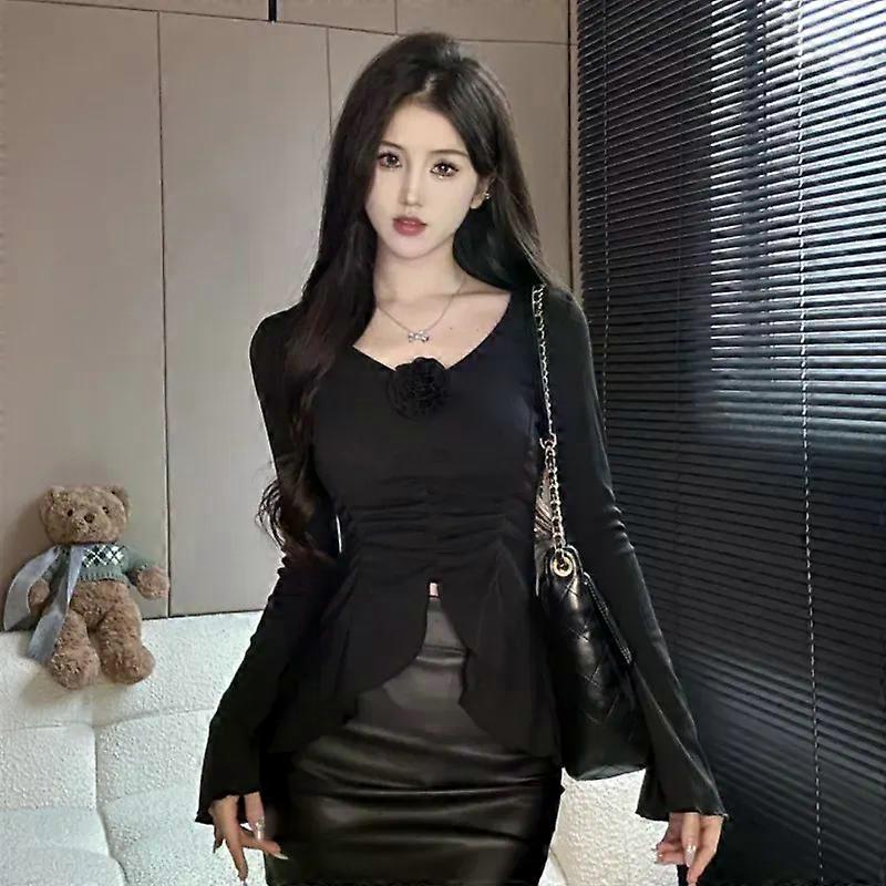 Women Spring Autumn Fashion Sexy Pleated Solid Color V-neck Flare Sleeve T-Shirt Ladies Elegant Temperament All-match Trend Tops