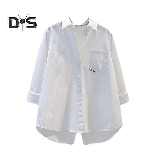 Women Spring Fall Shirt Turn-down Collar Loose Solid Color Single-breasted Mid Length Soft Breathable Long Sleeve Split Back Irregular Hem Lady