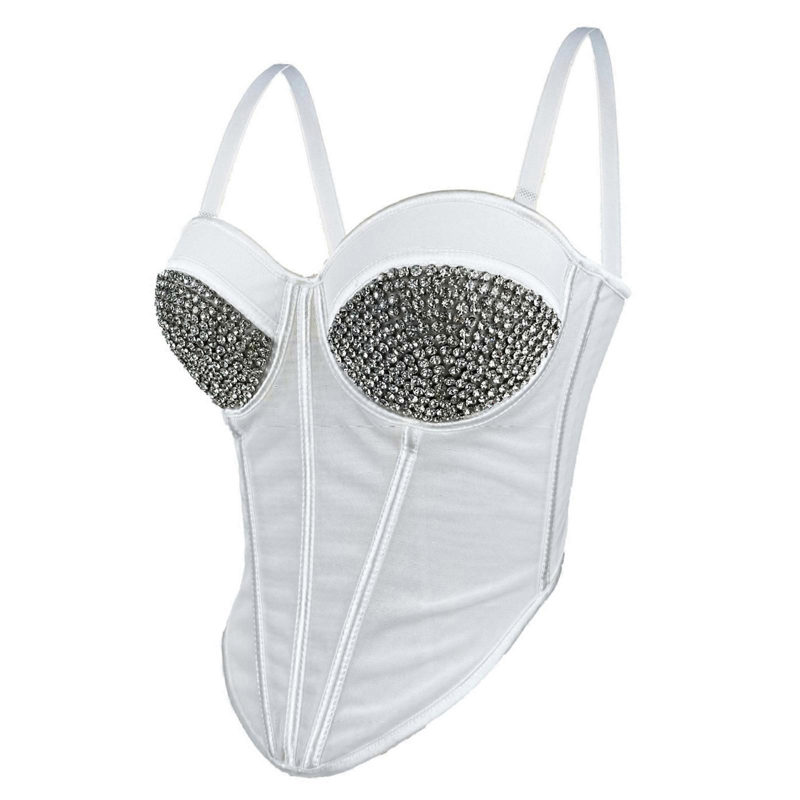 Womens Rhinestones Push Up Asymmetrical Bustier Crop Top Club Party Spaghetti Strap Underwired Fishbone Mesh Corset Vest 40 White