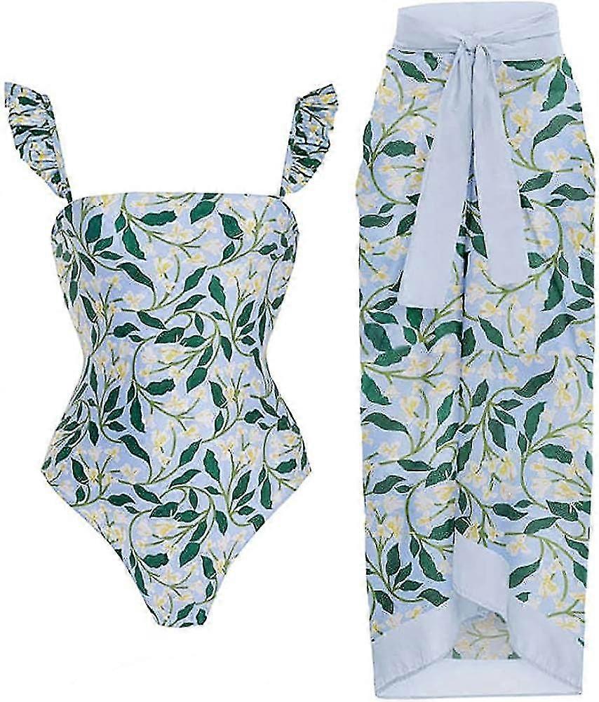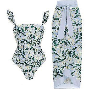 Women Two Piece Swimsuit V-neck Padded One-piece Monokini With Long Wrap Skirt Sarong Beach Cover Up Beachwear_fs